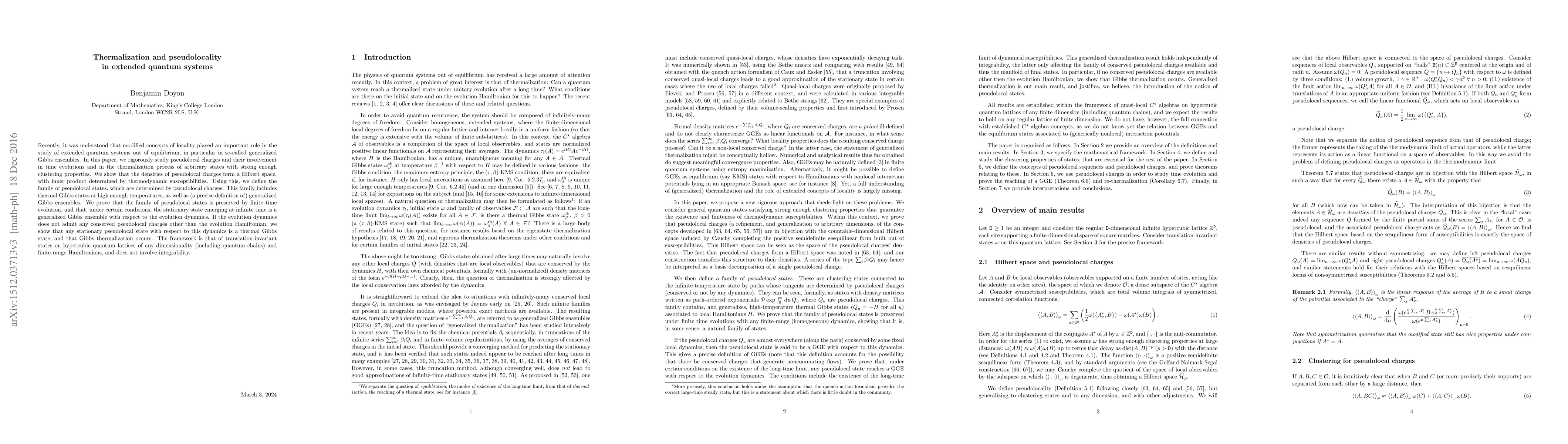This paper rigorously explores the concept of pseudolocal charges in the thermalization process of extended quantum systems, demonstrating that these charges form a Hilbert space and define a family of pseudolocal states, including generalized Gibbs ensembles. It shows that these states are preserved under finite time evolution and thermalize to Gibbs states under certain conditions.
