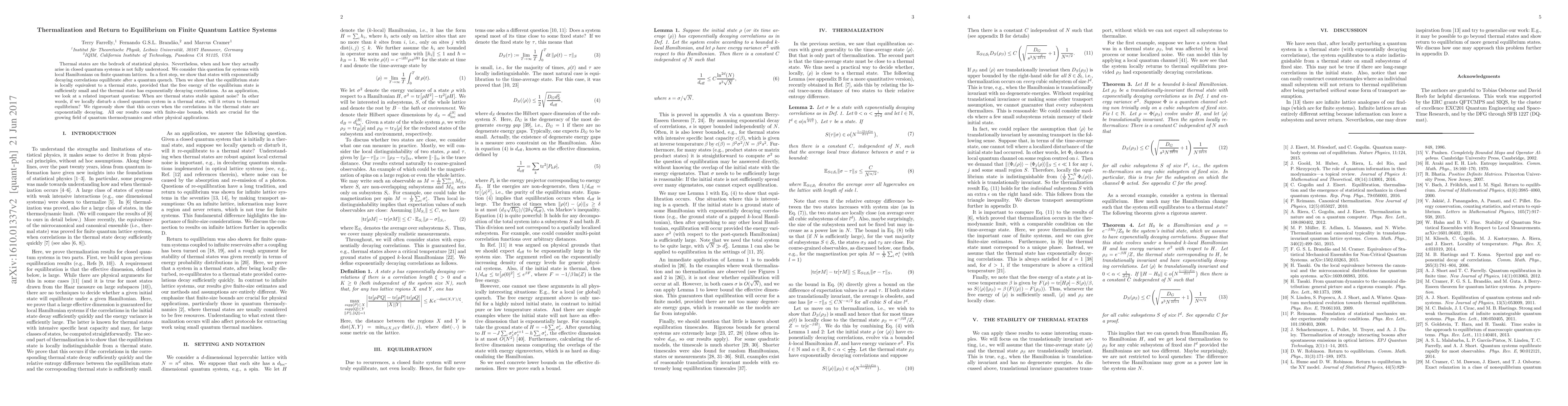 This paper investigates the thermalization process in finite quantum lattice systems following a quantum quench, demonstrating that states with exponentially decaying correlations equilibrate and resemble thermal states. It also establishes conditions under which thermal states remain stable against local perturbations, emphasizing the importance of exponentially decaying correlations.