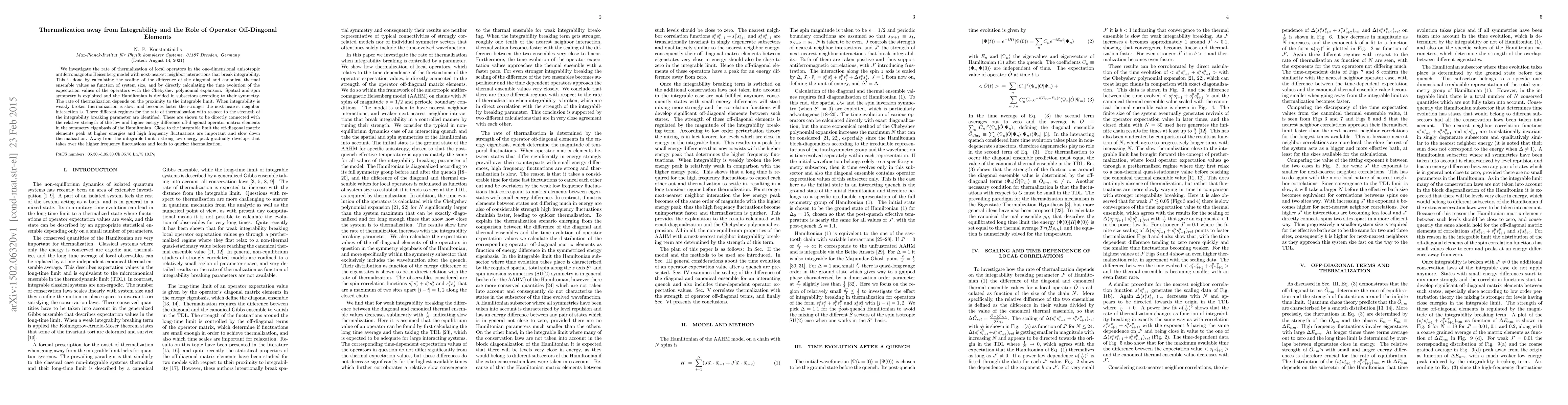Researchers study how local operators in an anisotropic Heisenberg model with broken integrability thermalize, finding that the rate of thermalization depends on the strength of integrability breaking and is influenced by off-diagonal operator matrix elements.