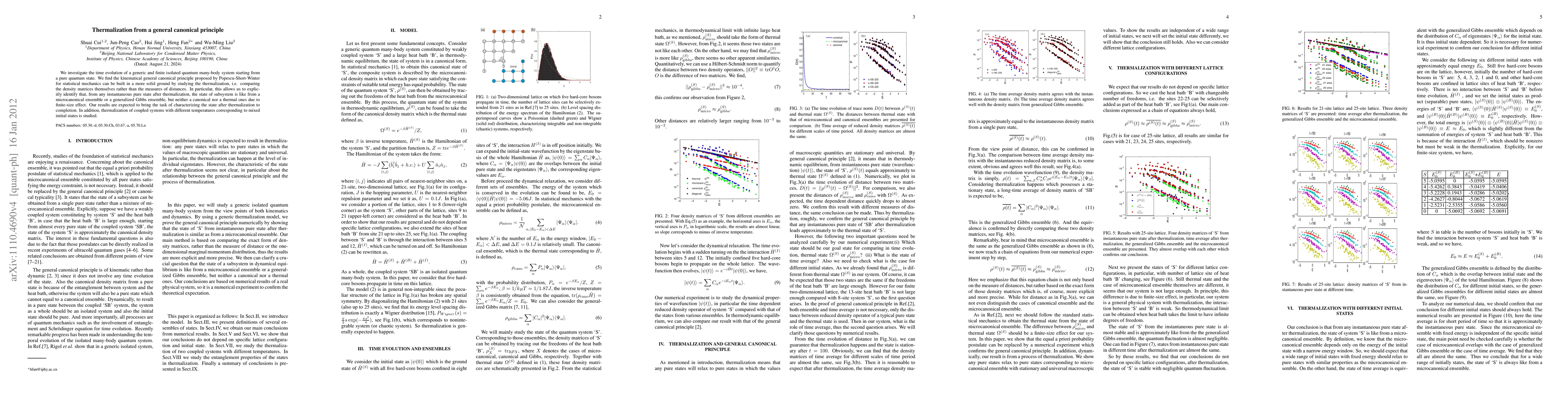 We investigate the time evolution of a generic and finite isolated quantum many-body system starting from a pure quantum state. We find the kinematical general canonical principle proposed by Popescu-Short-Winter for statistical mechanics can be built in a more solid ground by studying the thermalization, i.e. comparing the density matrices themselves rather than the measures of distances. In particular, this allows us to explicitly identify that, from any instantaneous pure state after thermalization, the state of subsystem is like from a microcanonical ensemble or a generalized Gibbs ensemble, but neither a canonical nor a thermal ones due to finite-size effect. Our results are expected to bring the task of characterizing the state after thermalization to completion. In addition, thermalization of coupled systems with different temperatures corresponding to mixed initial states is studied.