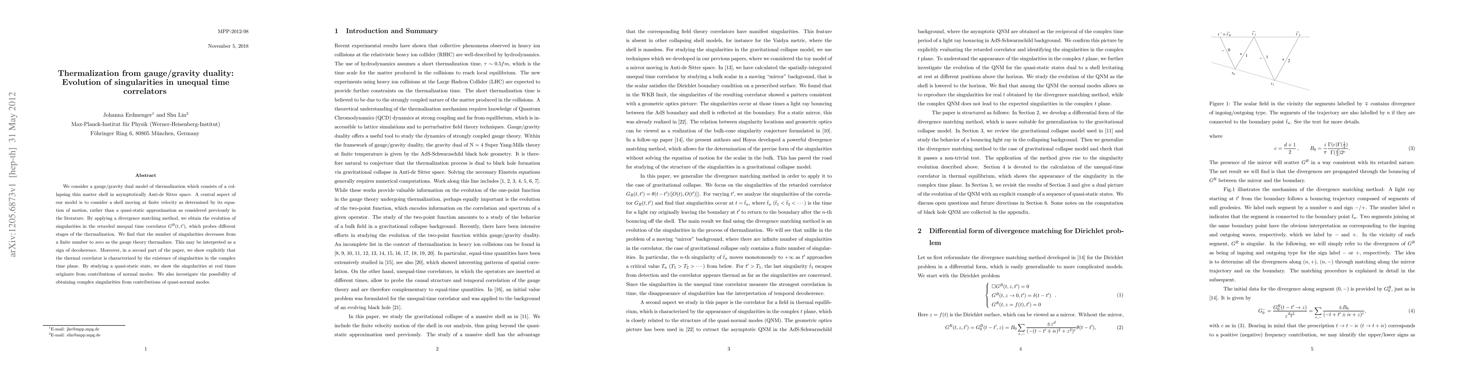We consider a gauge/gravity dual model of thermalization which consists of a collapsing thin matter shell in asymptotically Anti-de Sitter space. A central aspect of our model is to consider a shell moving at finite velocity as determined by its equation of motion, rather than a quasi-static approximation as considered previously in the literature. By applying a divergence matching method, we obtain the evolution of singularities in the retarded unequal time correlator $G^R(t,t')$, which probes different stages of the thermalization. We find that the number of singularities decreases from a finite number to zero as the gauge theory thermalizes. This may be interpreted as a sign of decoherence. Moreover, in a second part of the paper, we show explicitly that the thermal correlator is characterized by the existence of singularities in the complex time plane. By studying a quasi-static state, we show the singularities at real times originate from contributions of normal modes. We also investigate the possibility of obtaining complex singularities from contributions of quasi-normal modes.