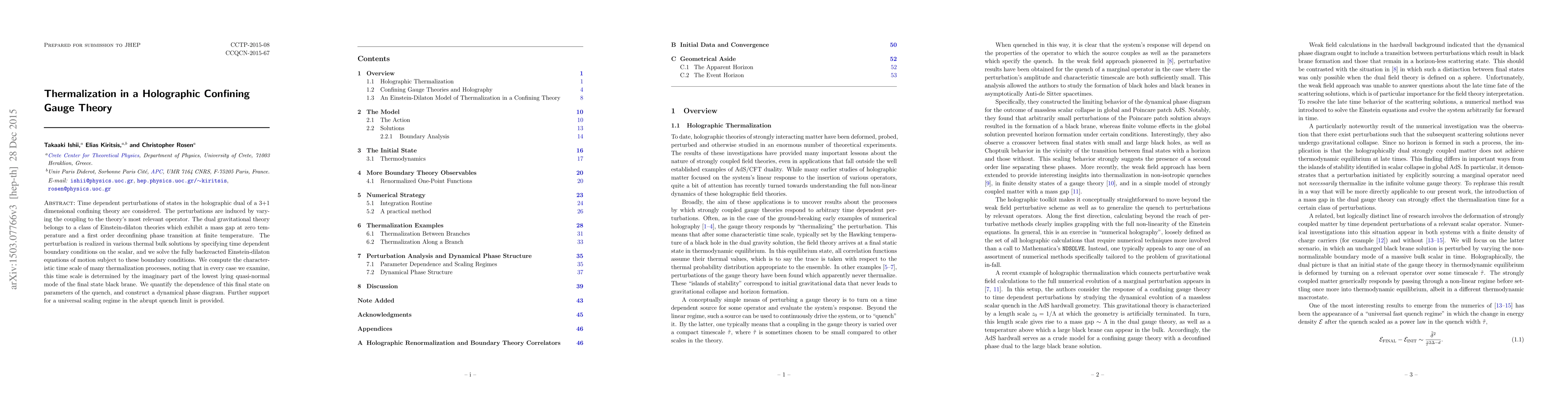 Time dependent perturbations of states in the holographic dual of a 3+1 dimensional confining theory are considered. The perturbations are induced by varying the coupling to the theory's most relevant operator. The dual gravitational theory belongs to a class of Einstein-dilaton theories which exhibit a mass gap at zero temperature and a first order deconfining phase transition at finite temperature. The perturbation is realized in various thermal bulk solutions by specifying time dependent boundary conditions on the scalar, and we solve the fully backreacted Einstein-dilaton equations of motion subject to these boundary conditions. We compute the characteristic time scale of many thermalization processes, noting that in every case we examine, this time scale is determined by the imaginary part of the lowest lying quasi-normal mode of the final state black brane. We quantify the dependence of this final state on parameters of the quench, and construct a dynamical phase diagram. Further support for a universal scaling regime in the abrupt quench limit is provided.