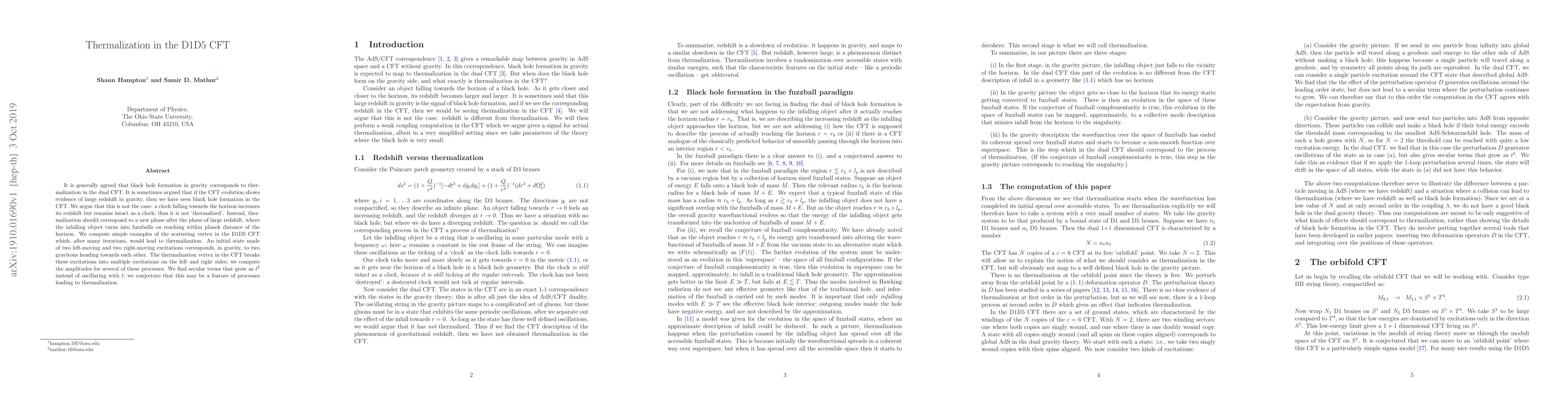 It is generally agreed that black hole formation in gravity corresponds to thermalization in the dual CFT. It is sometimes argued that if the CFT evolution shows evidence of large redshift in gravity, then we have seen black hole formation in the CFT. We argue that this is not the case: a clock falling towards the horizon increases its redshift but remains intact as a clock; thus it is not `thermalized'. Instead, thermalization should correspond to a new phase after the phase of large redshift, where the infalling object turns into fuzzballs on reaching within planck distance of the horizon. We compute simple examples of the scattering vertex in the D1D5 CFT which, after many iterations, would lead to thermalization. An initial state made of two left-moving and two right-moving excitations corresponds, in gravity, to two gravitons heading towards each other. The thermalization vertex in the CFT breaks these excitations into multiple excitations on the left and right sides; we compute the amplitudes for several of these processes. We find secular terms that grow as $t^2$ instead of oscillating with $t$; we conjecture that this may be a feature of processes leading to thermalization.