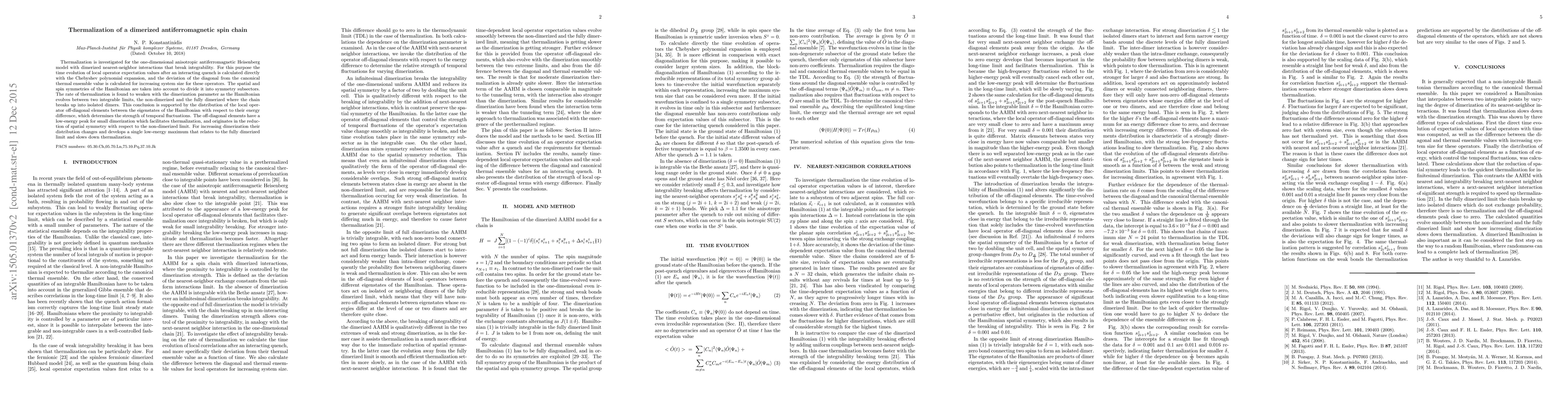 This paper investigates thermalization in a dimerized antiferromagnetic spin chain, finding that thermalization weakens with increasing dimerization. The study uses Chebyshev polynomial expansion to analyze local operator evolution post-quench, revealing that thermalization is facilitated by a low-energy peak in off-diagonal elements for small dimerization, which diminishes as dimerization increases.