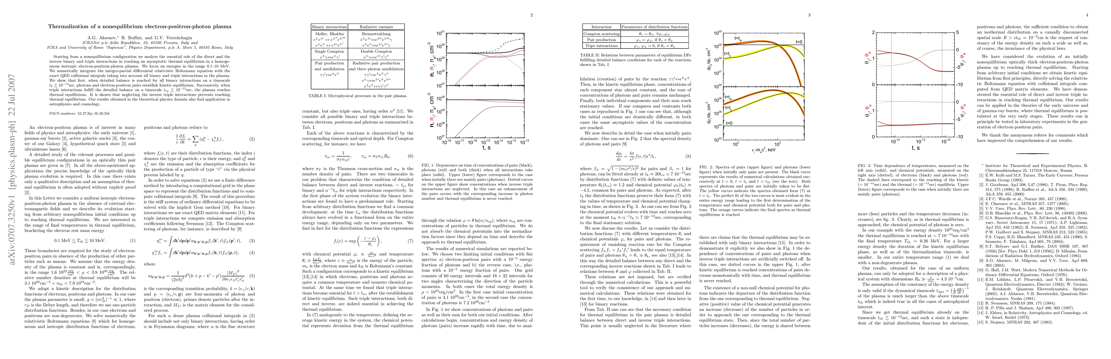 This paper investigates the thermalization process in a nonequilibrium electron-positron-photon plasma, demonstrating that detailed balance in binary interactions leads to kinetic equilibrium, while triple interactions are necessary for achieving thermal equilibrium. The study employs numerical integration of relativistic Boltzmann equations with QED collisional integrals.