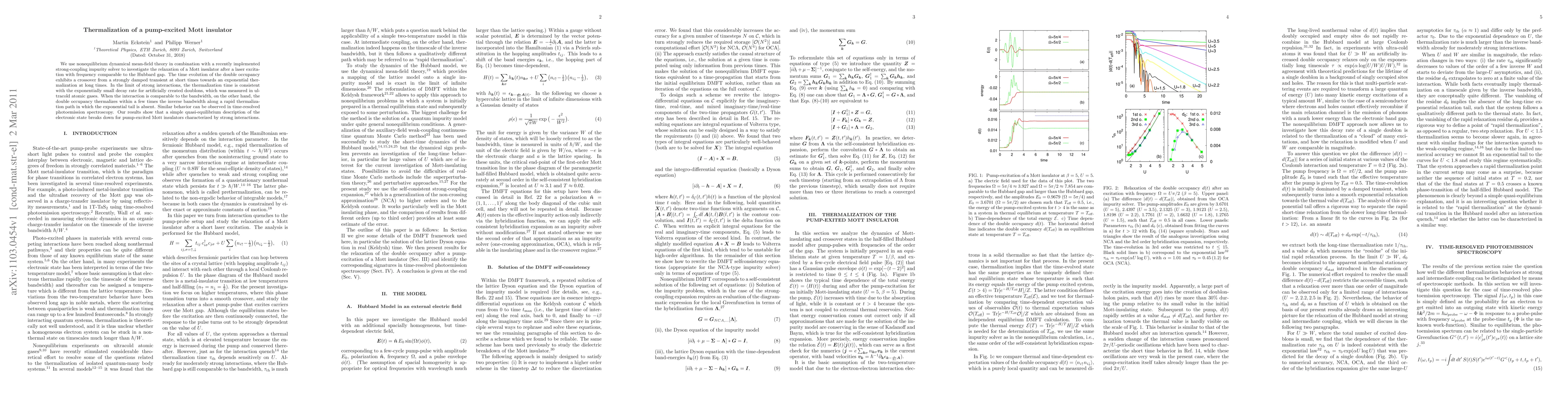 We use nonequilibrium dynamical mean-field theory in combination with a recently implemented strong-coupling impurity solver to investigate the relaxation of a Mott insulator after a laser excitation with frequency comparable to the Hubbard gap. The time evolution of the double occupancy exhibits a crossover from a strongly damped transient at short times towards an exponential thermalization at long times. In the limit of strong interactions, the thermalization time is consistent with the exponentially small decay rate for artificially created doublons, which was measured in ultracold atomic gases. When the interaction is comparable to the bandwidth, on the other hand, the double occupancy thermalizes within a few times the inverse bandwidth along a rapid thermalization path in which the exponential tail is absent. Similar behavior can be observed in time-resolved photoemission spectroscopy. Our results show that a simple quasi-equilibrium description of the electronic state breaks down for pump-excited Mott insulators characterized by strong interactions.