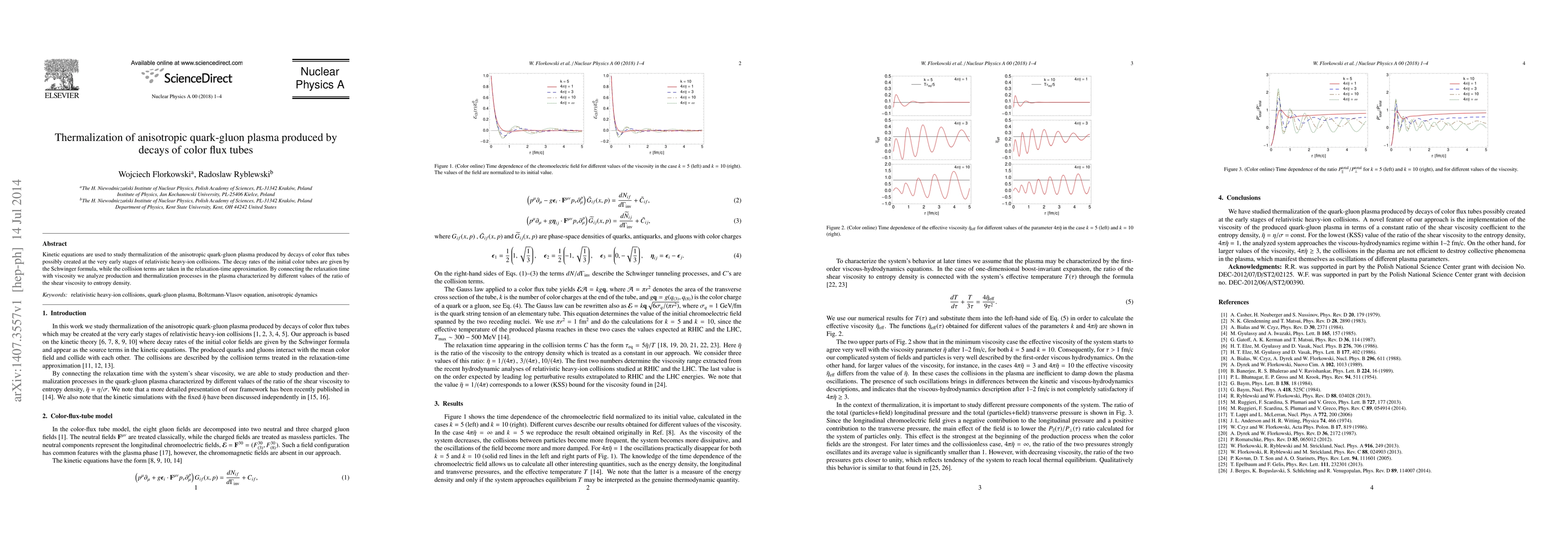 This paper investigates the thermalization process of anisotropic quark-gluon plasma generated from the decay of color flux tubes, using kinetic equations and the relaxation-time approximation. It connects relaxation time with viscosity to analyze production and thermalization under varying shear viscosity to entropy density ratios.