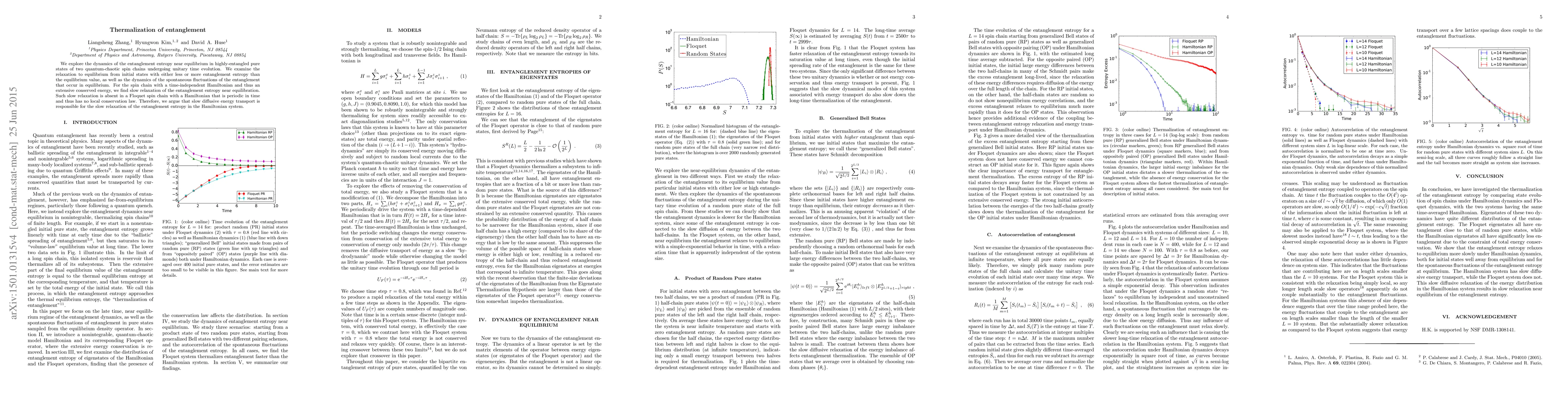 We explore the dynamics of the entanglement entropy near equilibrium in highly-entangled pure states of two quantum-chaotic spin chains undergoing unitary time evolution. We examine the relaxation to equilibrium from initial states with either less or more entanglement entropy than the equilibrium value, as well as the dynamics of the spontaneous fluctuations of the entanglement that occur in equilibrium. For the spin chain with a time-independent Hamiltonian and thus an extensive conserved energy, we find slow relaxation of the entanglement entropy near equilibration. Such slow relaxation is absent in a Floquet spin chain with a Hamiltonian that is periodic in time and thus has no local conservation law. Therefore, we argue that slow diffusive energy transport is responsible for the slow relaxation of the entanglement entropy in the Hamiltonian system.