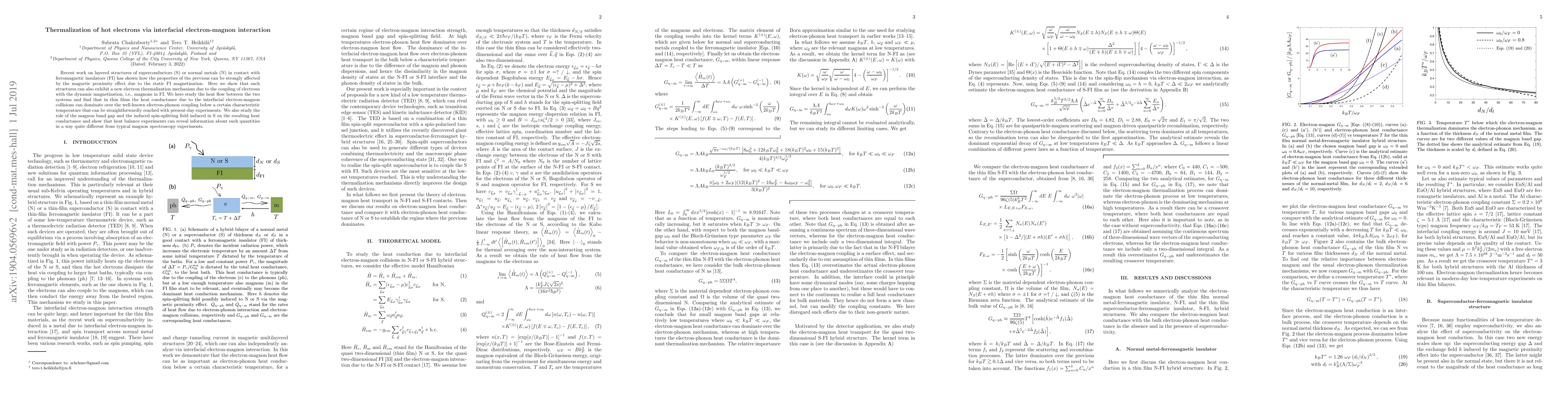 This paper explores a novel thermalization mechanism in layered superconductor or normal metal structures in contact with ferromagnetic insulators, where electron-magnon interactions dominate heat flow below a specific temperature. The study highlights the significance of interfacial electron-magnon collisions in heat conductance, offering insights into magnon band gaps and spin-splitting fields.