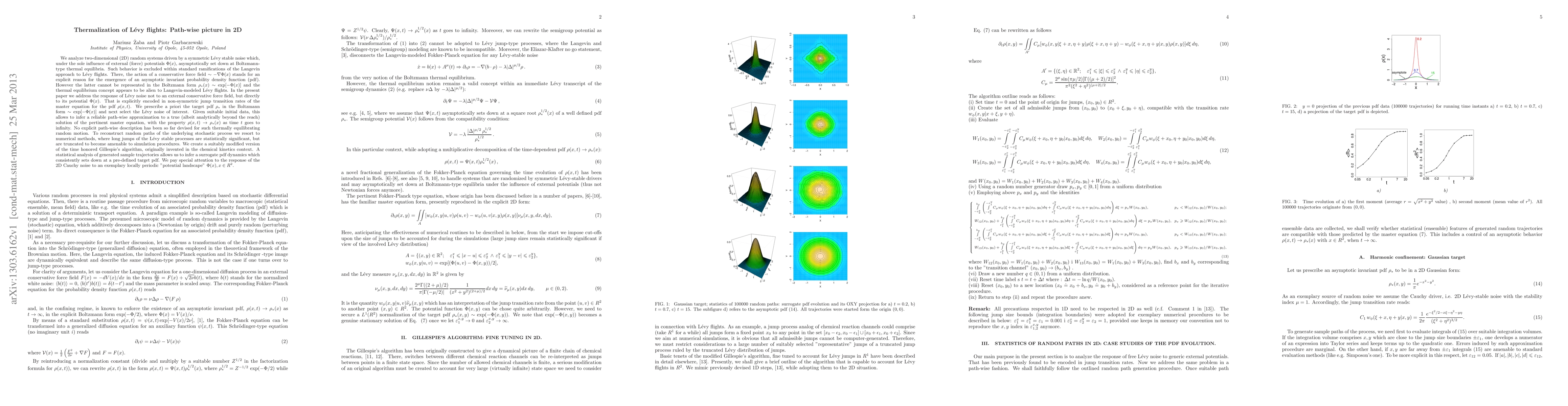 We analyze two-dimensional (2D) random systems driven by a symmetric L\'{e}vy stable noise which, under the sole influence of external (force) potentials $\Phi (x) $, asymptotically set down at Boltzmann-type thermal equilibria. Such behavior is excluded within standard ramifications of the Langevin approach to L\'{e}vy flights. In the present paper we address the response of L\'{e}vy noise not to an external conservative force field, but directly to its potential $\Phi (x)$. We prescribe a priori the target pdf $\rho_*$ in the Boltzmann form $\sim \exp[- \Phi (x)]$ and next select the L\'evy noise of interest. Given suitable initial data, this allows to infer a reliable path-wise approximation to a true (albeit analytically beyond the reach) solution of the pertinent master equation, with the property $\rho (x,t)\rightarrow \rho_*(x)$ as time $t$ goes to infinity. We create a suitably modified version of the time honored Gillespie's algorithm, originally invented in the chemical kinetics context. A statistical analysis of generated sample trajectories allows us to infer a surrogate pdf dynamics which consistently sets down at a pre-defined target pdf. We pay special attention to the response of the 2D Cauchy noise to an exemplary locally periodic "potential landscape" $\Phi (x), x\in R^2$.