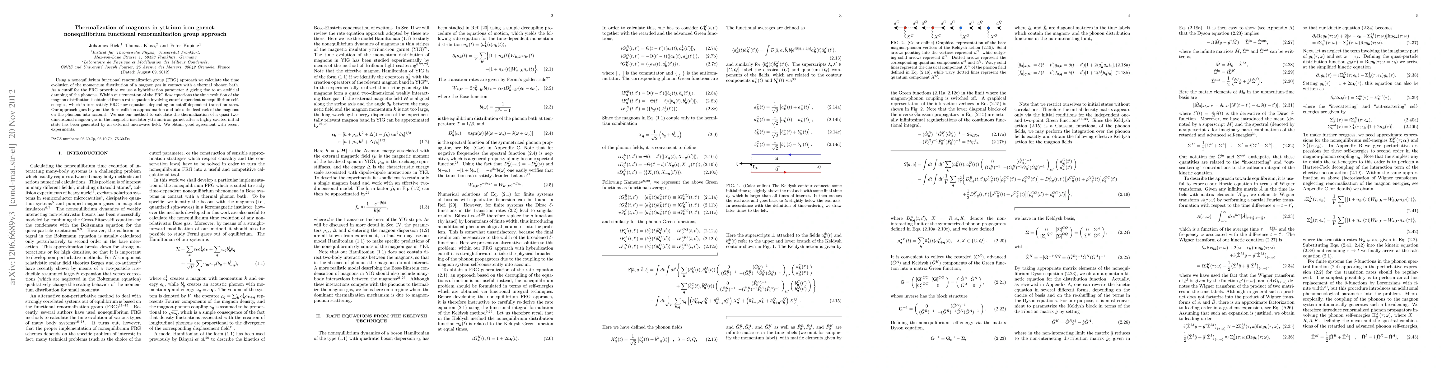 Using a nonequilibrium functional renormalization group (FRG) approach we calculate the time evolution of the momentum distribution of a magnon gas in contact with a thermal phonon bath. As a cutoff for the FRG procedure we use a hybridization parameter {\Lambda} giving rise to an artificial damping of the phonons. Within our truncation of the FRG flow equations the time evolution of the magnon distribution is obtained from a rate equation involving cutoff-dependent nonequilibrium self-energies, which in turn satisfy FRG flow equations depending on cutoff-dependent transition rates. Our approach goes beyond the Born collision approximation and takes the feedback of the magnons on the phonons into account. We use our method to calculate the thermalization of a quasi two-dimensional magnon gas in the magnetic insulator yttrium-iron garnet after a highly excited initial state has been generated by an external microwave field. We obtain good agreement with recent experiments.
