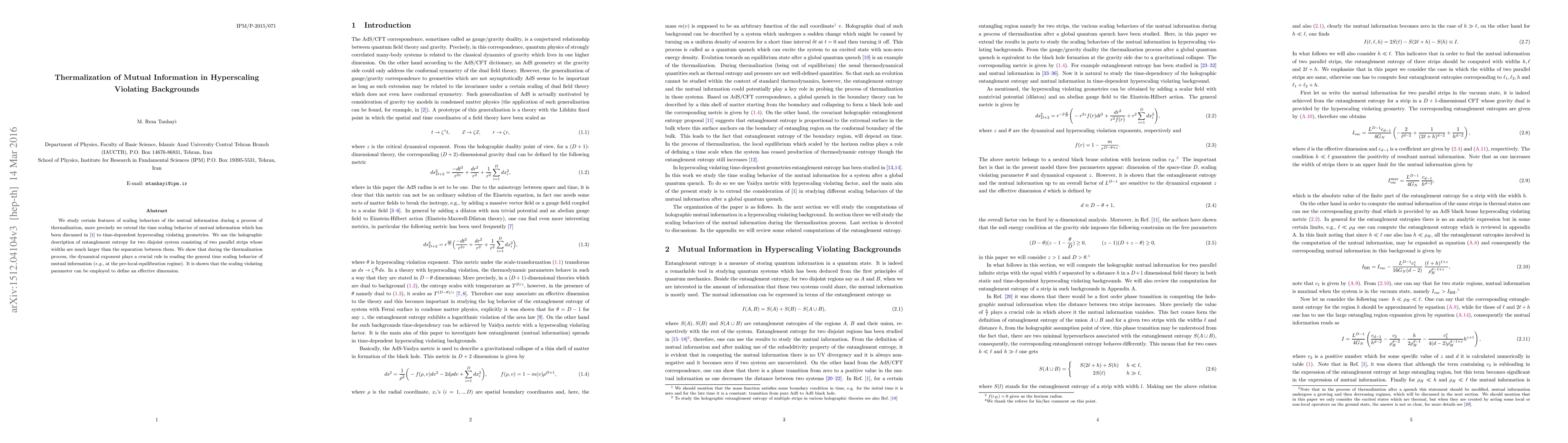 We study certain features of scaling behaviors of the mutual information during a process of thermalization, more precisely we extend the time scaling behavior of mutual information which has been discussed in \cite{Alishahiha:2014jxa} to time-dependent hyperscaling violating geometries. We use the holographic description of entanglement entropy for two disjoint system consisting of two parallel strips whose widths are much larger than the separation between them. We show that during the thermalization process, the dynamical exponent plays a crucial rule in reading the general time scaling behavior of mutual information (\emph{e.g.,} at the pre-local-equilibration regime). It is shown that the scaling violating parameter can be employed to define an effective dimension.