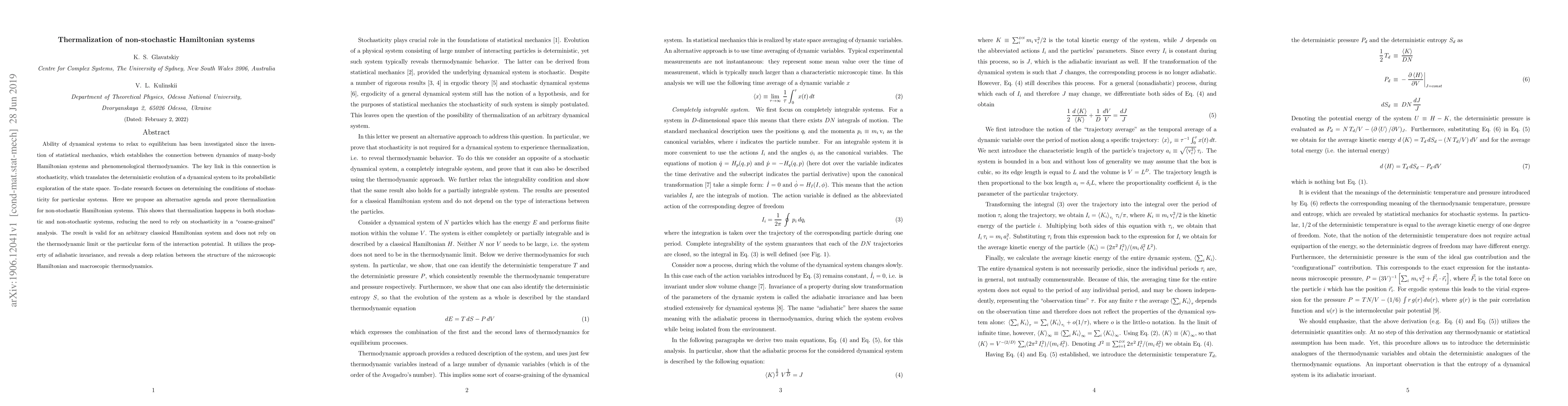 This paper demonstrates thermalization in non-stochastic Hamiltonian systems, showing that equilibrium can be reached without relying on stochasticity. The findings reveal a fundamental link between microscopic Hamiltonian dynamics and macroscopic thermodynamics, utilizing adiabatic invariance.