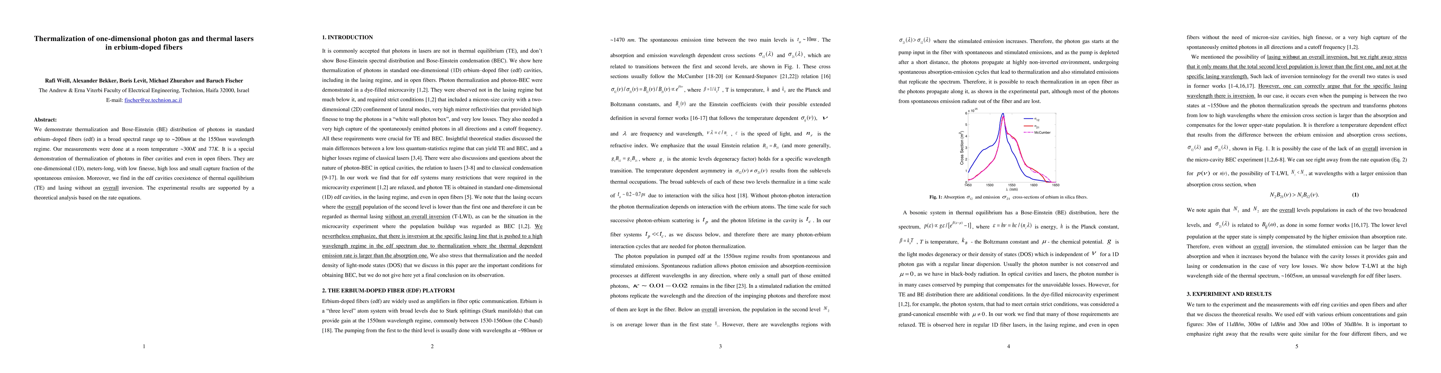 We demonstrate thermalization and Bose-Einstein (BE) distribution of photons in standard erbium-doped fibers (edf) in a broad spectral range up to ~200nm at the 1550nm wavelength regime. Our measurements were done at a room temperature ~300K and 77K. It is a special demonstration of thermalization of photons in fiber cavities and even in open fibers. They are one-dimensional (1D), meters-long, with low finesse, high loss and small capture fraction of the spontaneous emission. Moreover, we find in the edf cavities coexistence of thermal equilibrium (TE) and lasing without an overall inversion. The experimental results are supported by a theoretical analysis based on the rate equations.