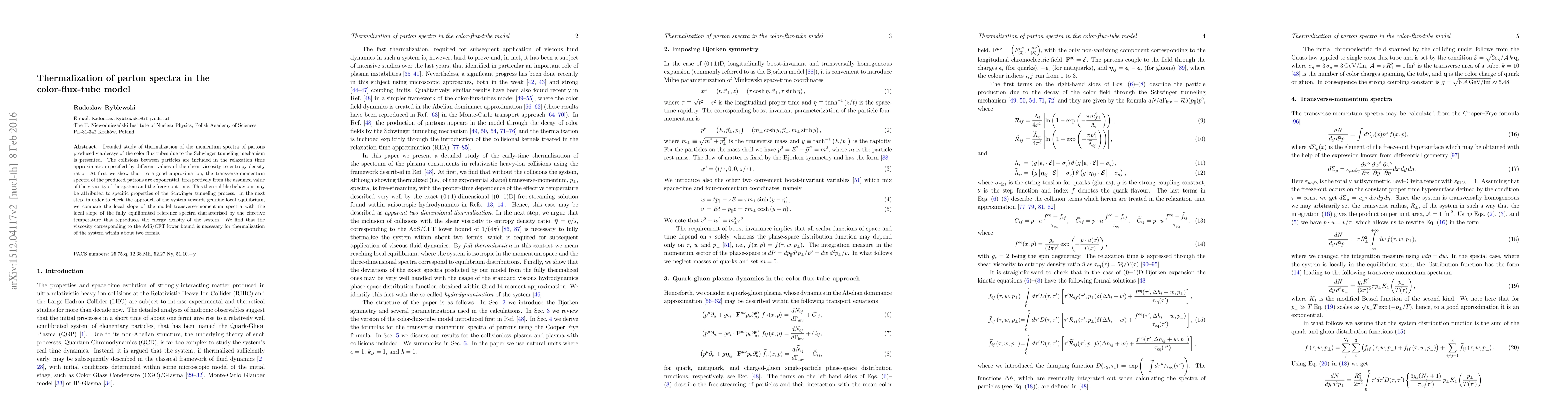 Detailed study of thermalization of the momentum spectra of partons produced via decays of the color flux tubes due to the Schwinger tunneling mechanism is presented. The collisions between particles are included in the relaxation time approximation specified by different values of the shear viscosity to entropy density ratio. At first we show that, to a good approximation, the transverse-momentum spectra of the produced patrons are exponential, irrespectively from the assumed value of the viscosity of the system and the freeze-out time. This thermal-like behaviour may be attributed to specific properties of the Schwinger tunneling process. In the next step, in order to check the approach of the system towards genuine local equilibrium, we compare the local slope of the model transverse-momentum spectra with the local slope of the fully equilibrated reference spectra characterised by the effective temperature that reproduces the energy density of the system. We find that the viscosity corresponding to the AdS/CFT lower bound is necessary for thermalization of the system within about two fermis.