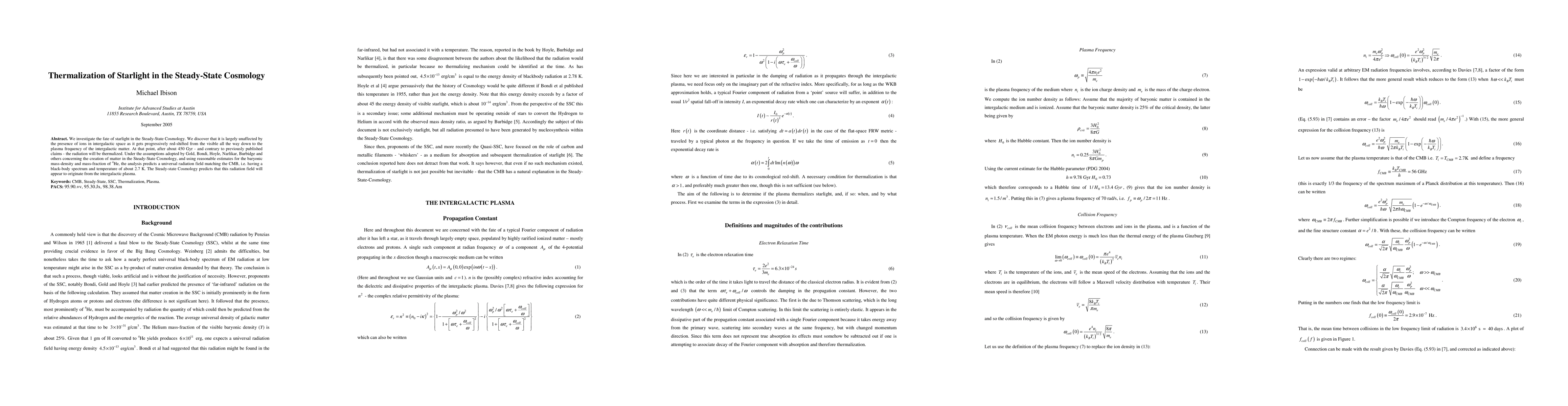 This paper explores the thermalization of starlight in the Steady-State Cosmology, finding that starlight is red-shifted to the plasma frequency of intergalactic matter over 450 Gyr, contrary to previous claims, leading to thermalization and matching the CMB's black-body spectrum at 2.7 K.