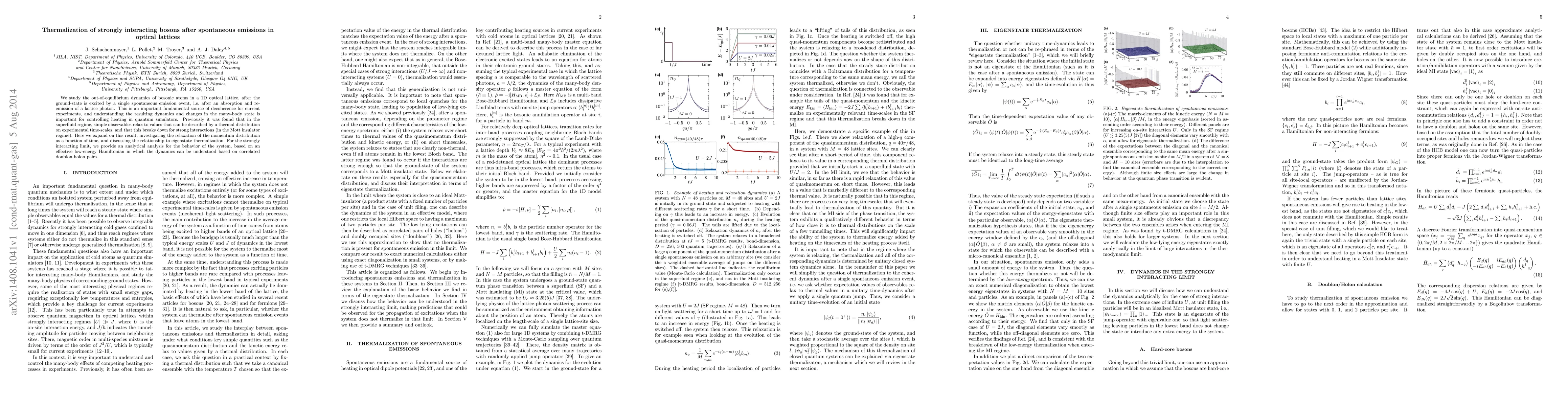 This paper investigates the thermalization dynamics of strongly interacting bosons in a 1D optical lattice following a spontaneous emission event, revealing that while simple observables relax to thermal distributions, strong interactions disrupt this behavior. An analytical model based on correlated doublon-holon pairs explains the system's dynamics in the strongly interacting regime.