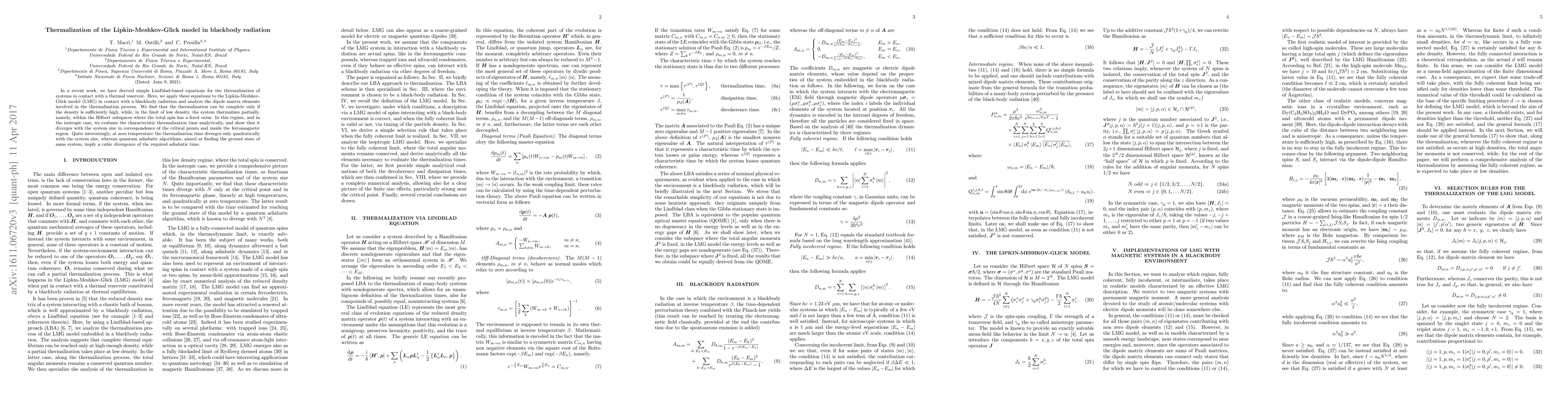 In a recent work, we have derived simple Lindblad-based equations for the thermalization of systems in contact with a thermal reservoir. Here, we apply these equations to the Lipkin-Meshkov-Glick model (LMG) in contact with a blackbody radiation and analyze the dipole matrix elements involved in the thermalization process. We find that the thermalization can be complete only if the density is sufficiently high, while, in the limit of low density, the system thermalizes partially, namely, within the Hilbert subspaces where the total spin has a fixed value. In this regime, and in the isotropic case, we evaluate the characteristic thermalization time analytically, and show that it diverges with the system size in correspondence of the critical points and inside the ferromagnetic region. Quite interestingly, at zero temperature the thermalization time diverges only quadratically with the system size, whereas quantum adiabatic algorithms, aimed at finding the ground state of same system, imply a cubic divergence of the required adiabatic time.