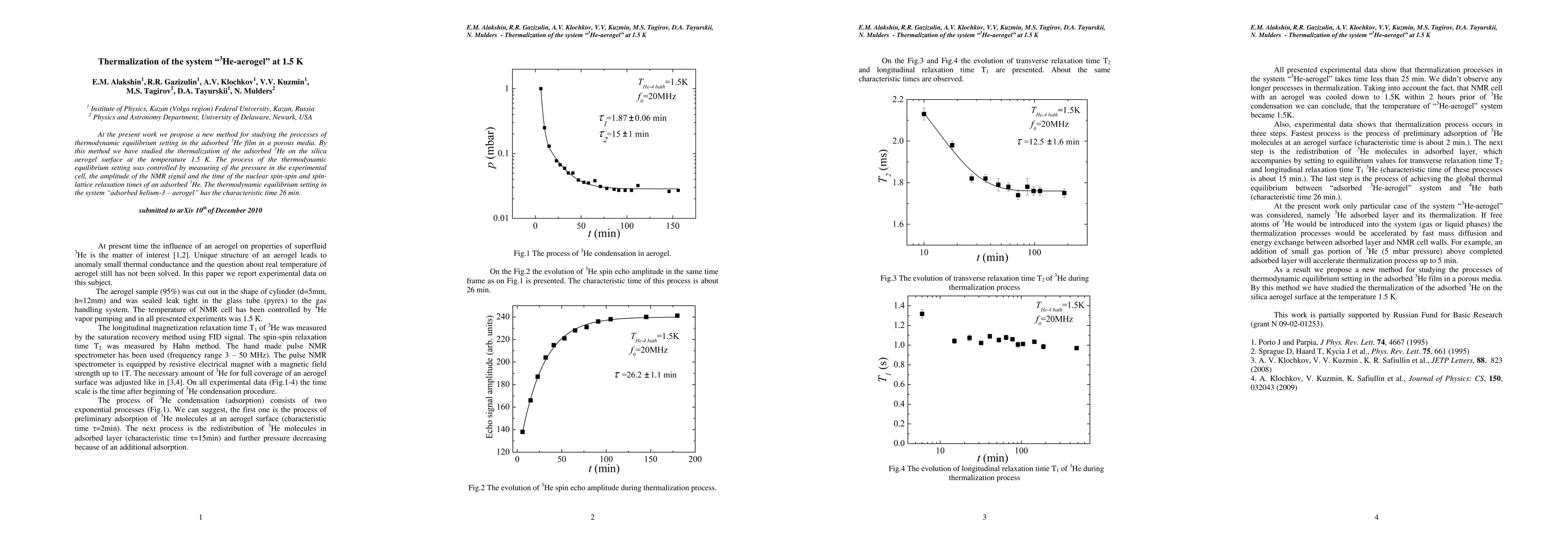 This study introduces a novel method for observing the thermalization process in adsorbed 3He films on silica aerogel at 1.5 K, utilizing pressure measurements, NMR signal amplitude, and nuclear spin relaxation times, finding a characteristic equilibrium time of 26 minutes.