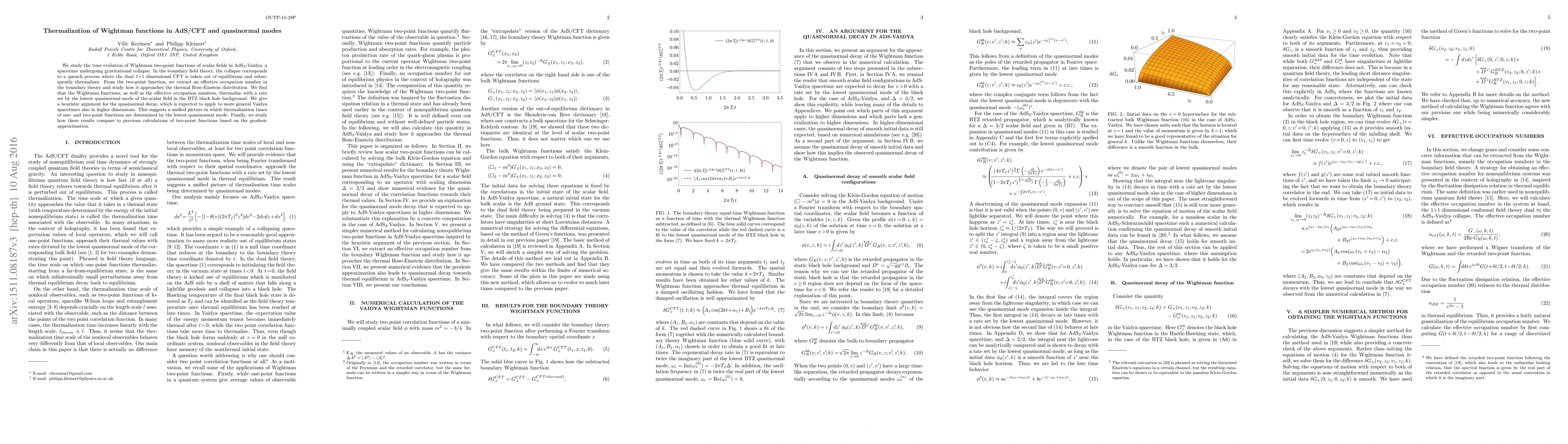This paper investigates the thermalization of Wightman functions in AdS$_3$-Vaidya spacetime during gravitational collapse, showing that both functions and effective occupation numbers thermalize at a rate set by the lowest quasinormal mode of the scalar field. The study suggests a unified thermalization mechanism for one- and two-point functions in AdS/CFT.