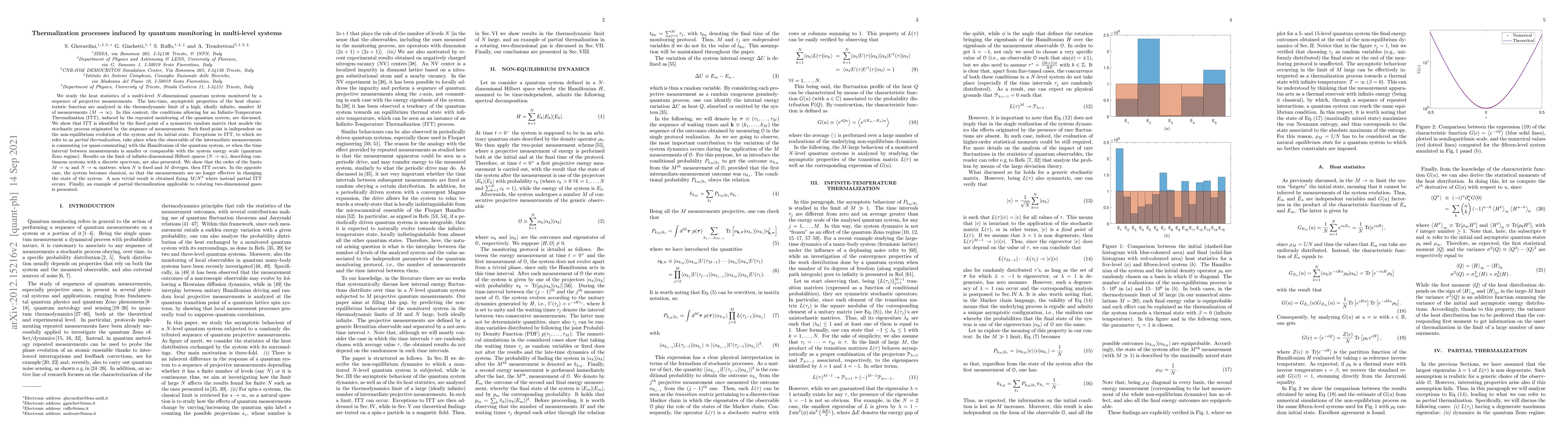 We study the heat statistics of a multi-level $N$-dimensional quantum system monitored by a sequence of projective measurements. The late-time, asymptotic properties of the heat characteristic function are analyzed in the thermodynamic limit of a high, ideally infinite, number $M$ of measurements $(M \to \infty)$. In this context, the conditions allowing for an Infinite-Temperature Thermalization (ITT), induced by the repeated monitoring of the quantum system, are discussed. We show that ITT is identified by the fixed point of a symmetric random matrix that models the stochastic process originated by the sequence of measurements. Such fixed point is independent on the non-equilibrium evolution of the system and its initial state. Exceptions to ITT, to which we refer to as partial thermalization, take place when the observable of the intermediate measurements is commuting (or quasi-commuting) with the Hamiltonian of the quantum system, or when the time interval between measurements is smaller or comparable with the system energy scale (quantum Zeno regime). Results on the limit of infinite-dimensional Hilbert spaces ($N \to \infty$), describing continuous systems with a discrete spectrum, are also presented. We show that the order of the limits $M\to\infty$ and $N\to\infty$ matters: when $N$ is fixed and $M$ diverges, then ITT occurs. In the opposite case, the system becomes classical, so that the measurements are no longer effective in changing the state of the system. A non trivial result is obtained fixing $M/N^2$ where instead partial ITT occurs. Finally, an example of partial thermalization applicable to rotating two-dimensional gases is presented.