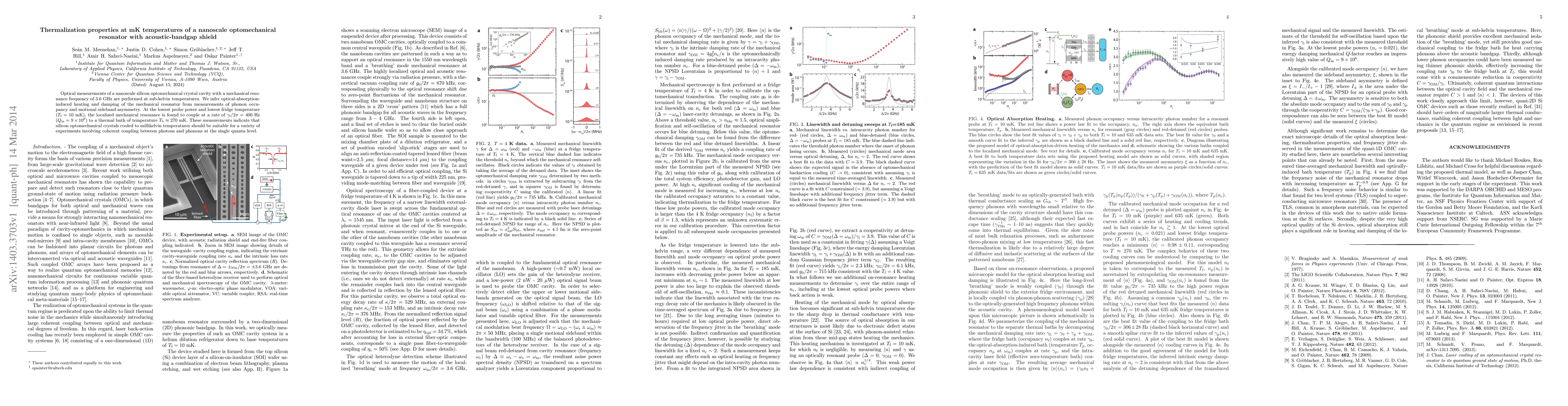Optical measurements of a nanoscale silicon optomechanical crystal cavity with a mechanical resonance frequency of 3.6GHz are performed at sub-kelvin temperatures. We infer optical-absorption-induced heating and damping of the mechanical resonator from measurements of phonon occupancy and motional sideband asymmetry. At the lowest probe power and lowest fridge temperature (10mK), the localized mechanical resonance is found to couple at a rate of 400Hz (Q=9x10^6) to a thermal bath of temperature 270mK. These measurements indicate that silicon optomechanical crystals cooled to millikelvin temperatures should be suitable for a variety of experiments involving coherent coupling between photons and phonons at the single quanta level.