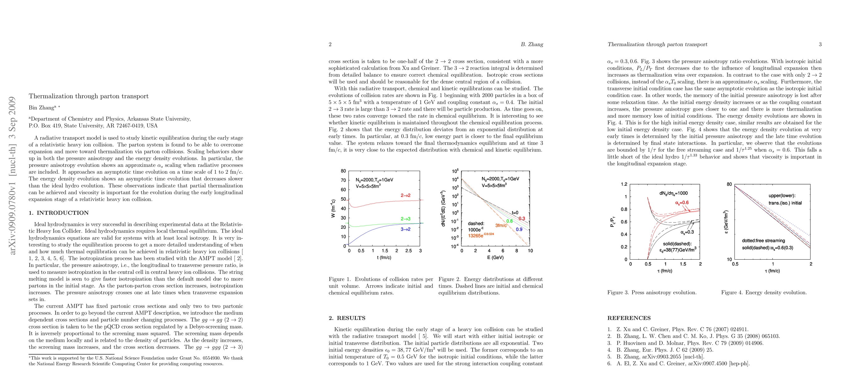 A radiative transport model is used to study kinetic equilibration during the early stage of a relativistic heavy ion collision. The parton system is found to be able to overcome expansion and move toward thermalization via parton collisions. Scaling behaviors show up in both the pressure anisotropy and the energy density evolutions. In particular, the pressure anisotropy evolution shows an approximate alpha_s scaling when radiative processes are included. It approaches an asymptotic time evolution on a time scale of 1 to 2 fm/c. The energy density evolution shows an asymptotic time evolution that decreases slower than the ideal hydro evolution. These observations indicate that partial thermalization can be achieved and viscosity is important for the evolution during the early longitudinal expansion stage of a relativistic heavy ion collision.