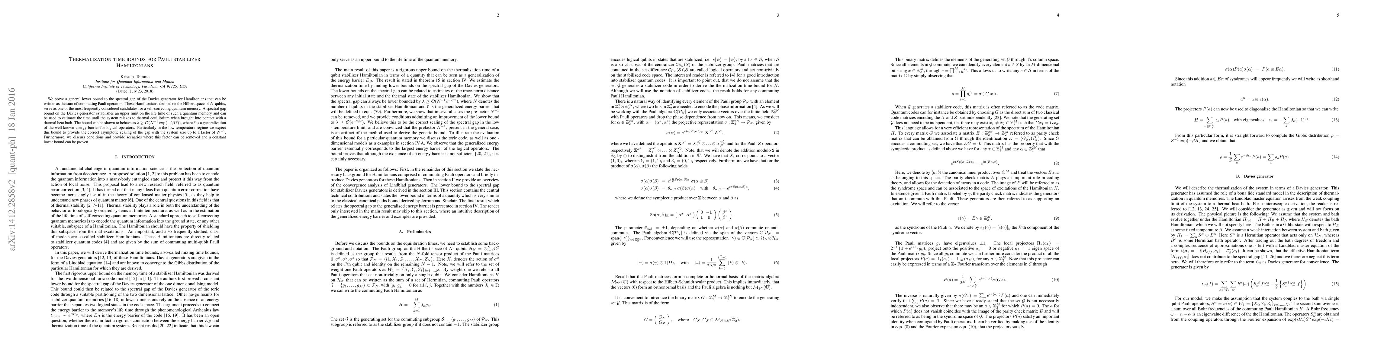 We prove a general lower bound to the spectral gap of the Davies generator for Hamiltonians that can be written as the sum of commuting Pauli operators. These Hamiltonians, defined on the Hilbert space of $N$-qubits, serve as one of the most frequently considered candidates for a self-correcting quantum memory. A spectral gap bound on the Davies generator establishes an upper limit on the life time of such a quantum memory and can be used to estimate the time until the system relaxes to thermal equilibrium when brought into contact with a thermal heat bath. The bound can be shown to behave as $\lambda \geq {\cal O}(N^{-1}\exp(-2\beta \, \overline{\epsilon}))$, where $\overline{\epsilon}$ is a generalization of the well known energy barrier for logical operators. Particularly in the low temperature regime we expect this bound to provide the correct asymptotic scaling of the gap with the system size up to a factor of $N^{-1}$. Furthermore, we discuss conditions and provide scenarios where this factor can be removed and a constant lower bound can be proven