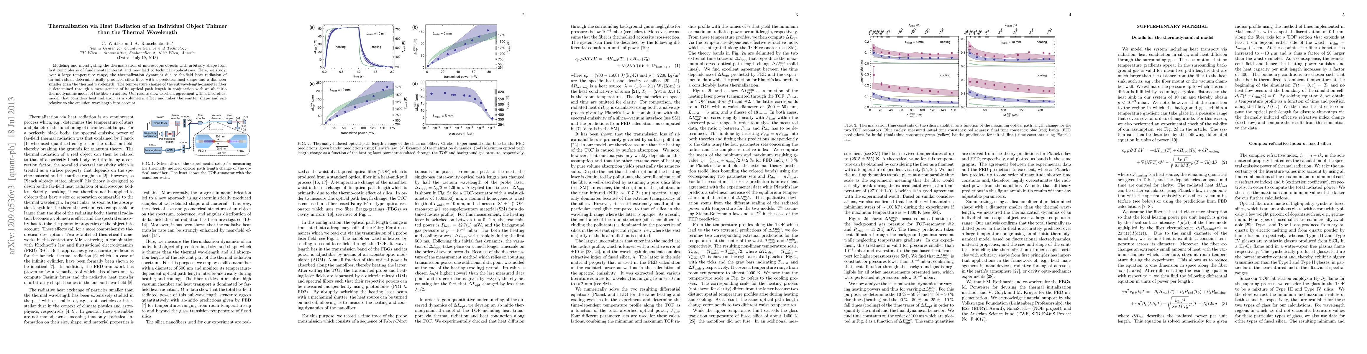 This research demonstrates that individual silica fibers, smaller than the thermal wavelength, can thermalize via heat radiation across a broad temperature range. The study uses optical path length measurement and ab initio thermodynamic modeling to track temperature changes, showing strong agreement with a theoretical model considering radiation as a volumetric effect and incorporating the fiber's shape and size relative to emission wavelength.
