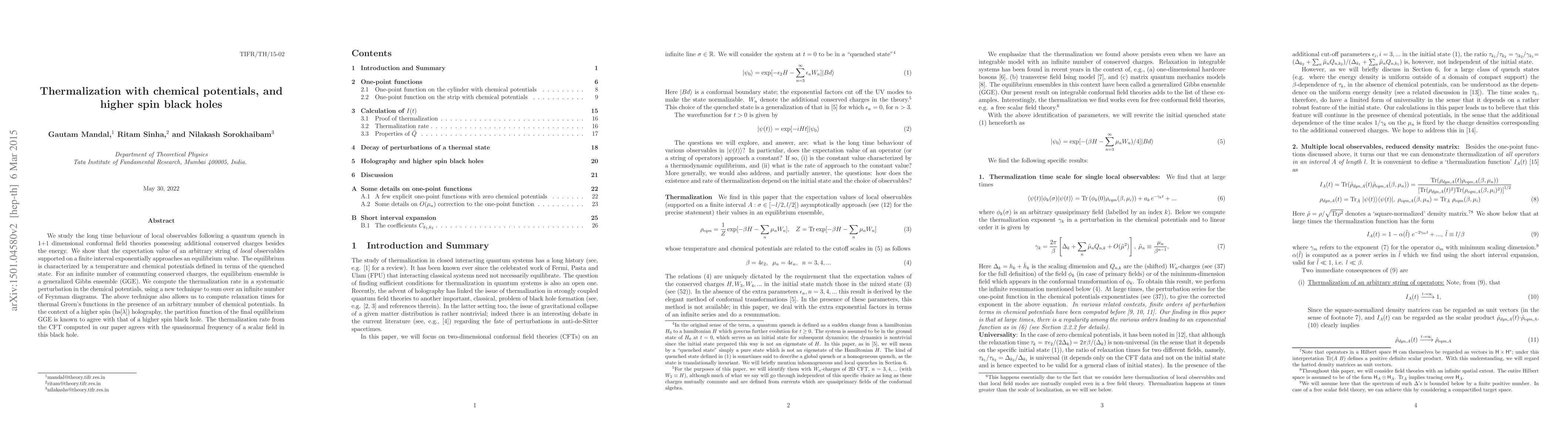 This paper investigates the thermalization dynamics in 1+1 dimensional conformal field theories with additional conserved charges, showing that local observables reach equilibrium characterized by temperature and chemical potentials. The thermalization rate is computed using a novel technique, and the results align with the quasinormal frequencies of higher spin black holes in holography.