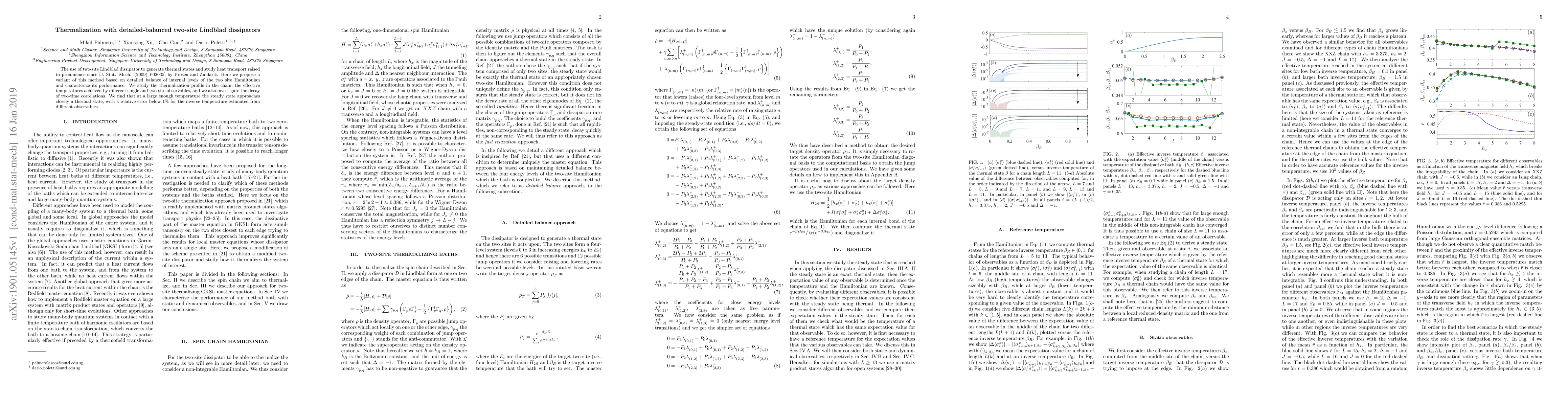 This paper proposes a detailed-balanced two-site Lindblad dissipator method for generating thermal states and studying heat transport, achieving a thermalization profile with effective temperatures and low relative error. The study also examines the decay of two-time correlations in the system.