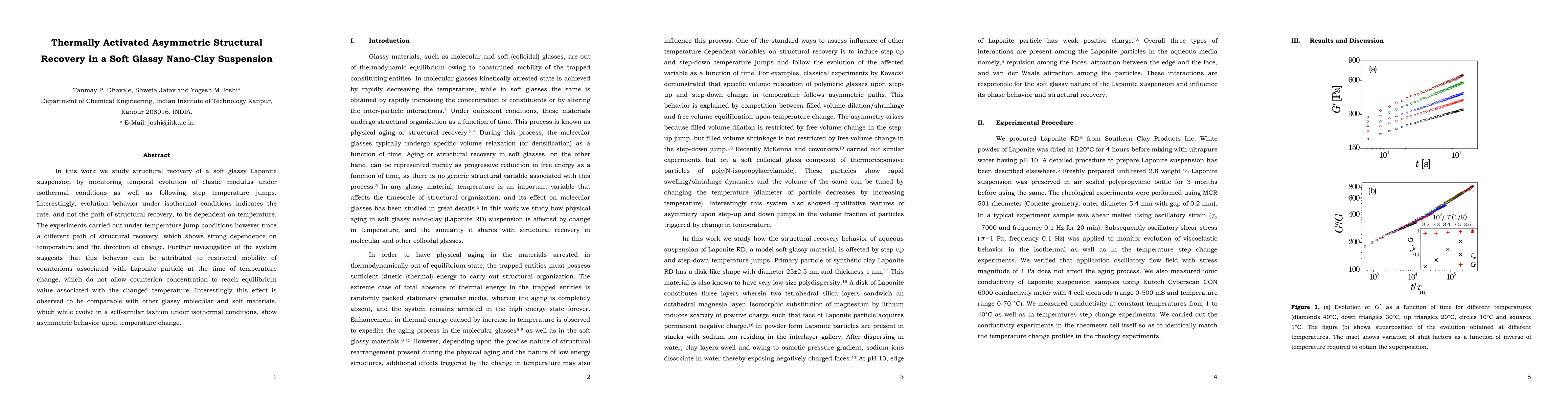 In this work we study structural recovery of a soft glassy Laponite suspension by monitoring temporal evolution of elastic modulus under isothermal conditions as well as following step temperature jumps. Interestingly, evolution behavior under isothermal conditions indicates the rate, and not the path of structural recovery, to be dependent on temperature. The experiments carried out under temperature jump conditions however trace a different path of structural recovery, which shows strong dependence on temperature and the direction of change. Further investigation of the system suggests that this behavior can be attributed to restricted mobility of counterions associated with Laponite particle at the time of temperature change, which do not allow counterion concentration to reach equilibrium value associated with the changed temperature. Interestingly this effect is observed to be comparable with other glassy molecular and soft materials, which while evolve in a self-similar fashion under isothermal conditions, show asymmetric behavior upon temperature change.