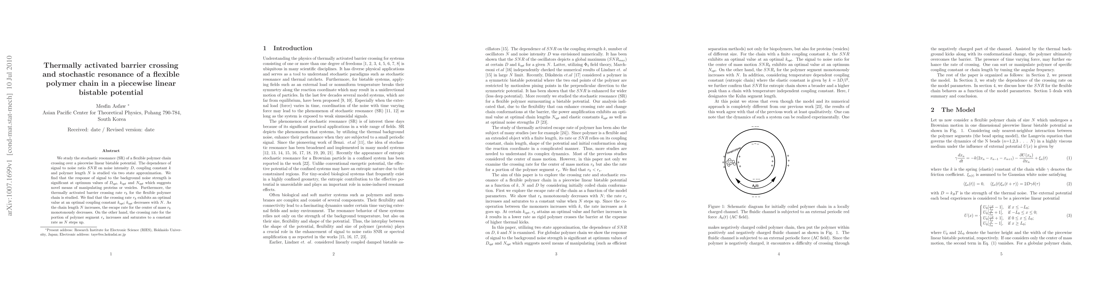 This paper investigates stochastic resonance in a flexible polymer chain within a piecewise linear bistable potential, revealing significant signal response at optimal noise and coupling conditions. It also examines the thermally activated barrier crossing rate, finding optimal values dependent on polymer length and coupling constant, with implications for manipulating biological structures.