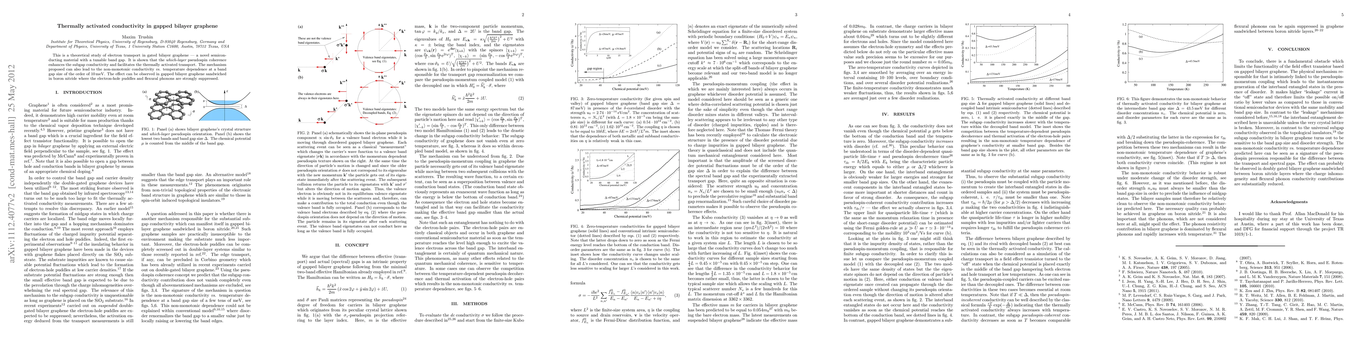 This is a theoretical study of electron transport in gated bilayer graphene - a novel semiconducting material with a tunable band gap. It is shown that the which-layer pseudospin coherence enhances the subgap conductivity and facilitates the thermally activated transport. The mechanism proposed can also lead to the non-monotonic conductivity vs. temperature dependence at a band gap size of the order of 10 meV. The effect can be observed in gapped bilayer graphene sandwiched in boron nitride where the electron-hole puddles and flexural phonons are strongly suppressed.