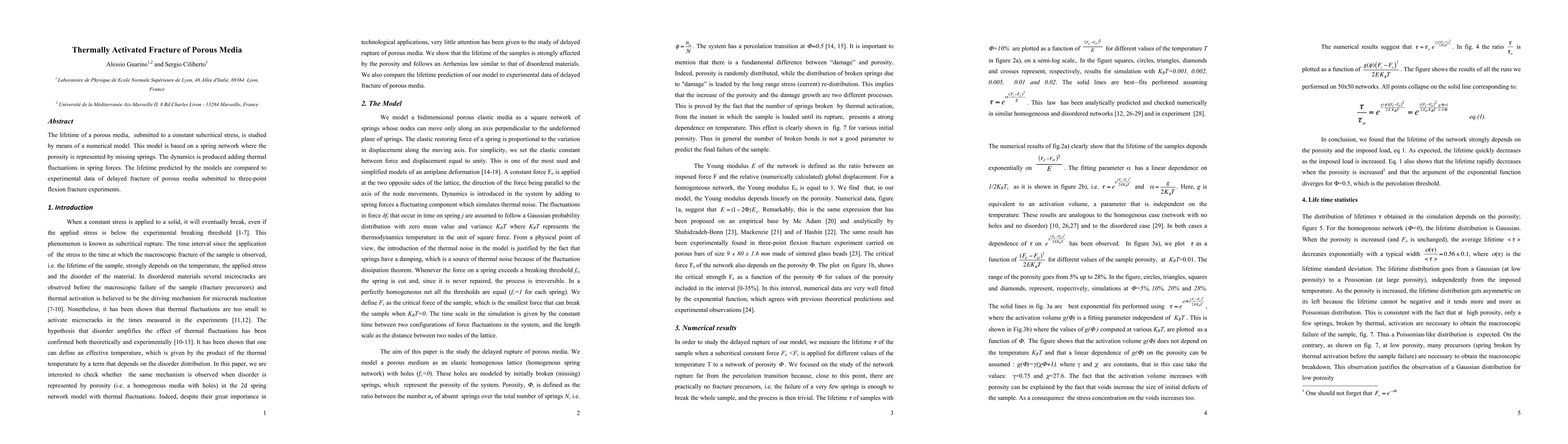 This paper investigates the lifetime of porous media under constant subcritical stress using a numerical spring network model with thermal fluctuations, and compares the predicted fracture lifetimes to experimental results from three-point flexion fracture tests. The model's accuracy in simulating delayed fracture is evaluated against empirical data.