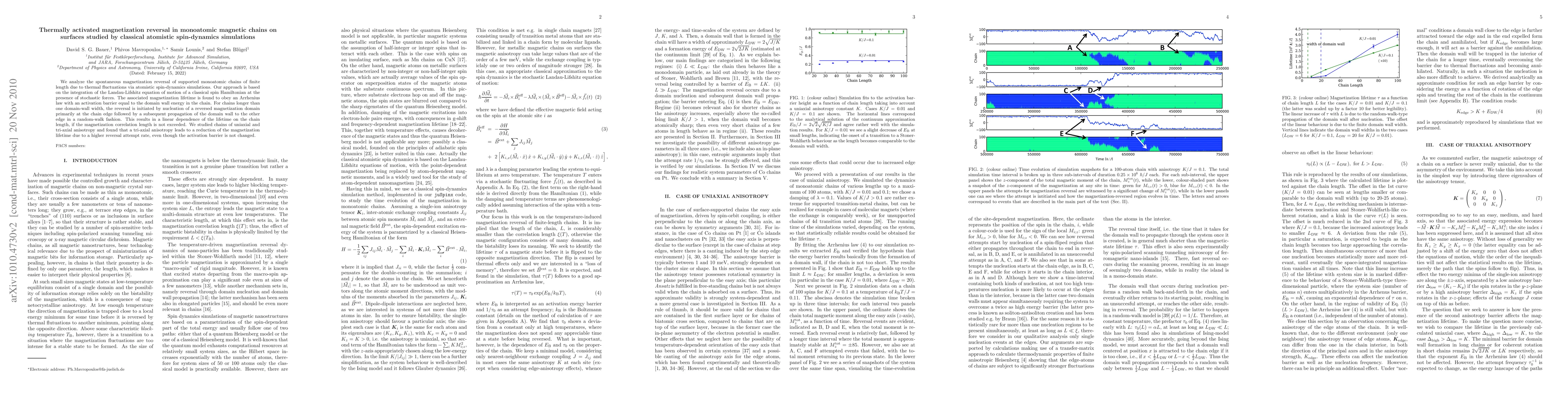 We analyze the spontaneous magnetization reversal of supported monoatomic chains of finite length due to thermal fluctuations via atomistic spin-dynamics simulations. Our approach is based on the integration of the Landau-Lifshitz equation of motion of a classical spin Hamiltonian at the presence of stochastic forces. The associated magnetization lifetime is found to obey an Arrhenius law with an activation barrier equal to the domain wall energy in the chain. For chains longer than one domain-wall width, the reversal is initiated by nucleation of a reversed magnetization domain primarily at the chain edge followed by a subsequent propagation of the domain wall to the other edge in a random-walk fashion. This results in a linear dependence of the lifetime on the chain length, if the magnetization correlation length is not exceeded. We studied chains of uniaxial and tri-axial anisotropy and found that a tri-axial anisotropy leads to a reduction of the magnetization lifetime due to a higher reversal attempt rate, even though the activation barrier is not changed.