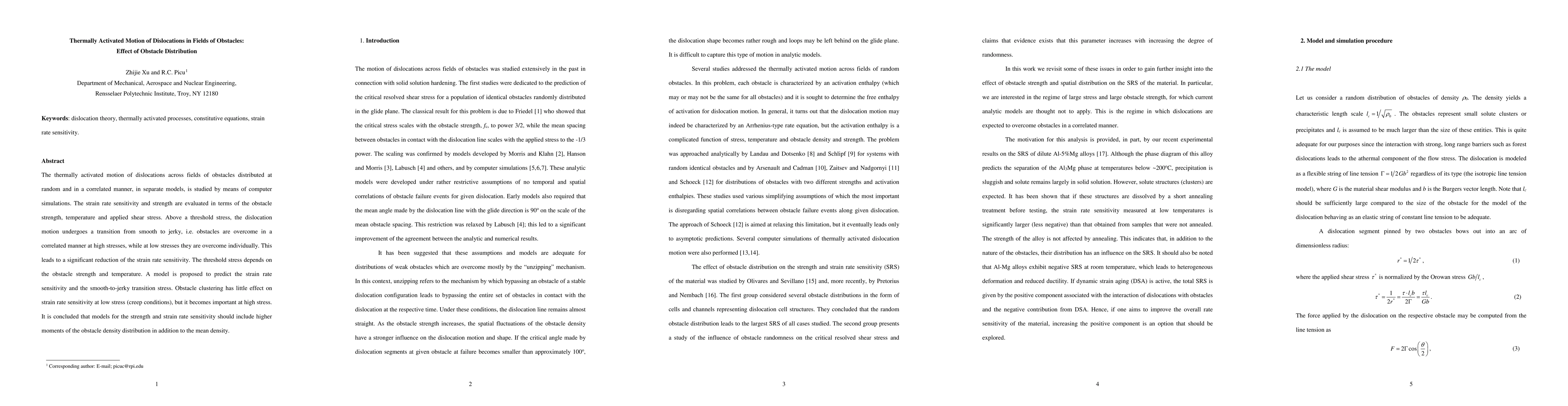 Researchers studied how dislocations move past obstacles in materials at different temperatures and stresses, finding that obstacle clustering affects this process only at high stresses. They propose a model to predict strain rate sensitivity and the transition from smooth to jerky motion.