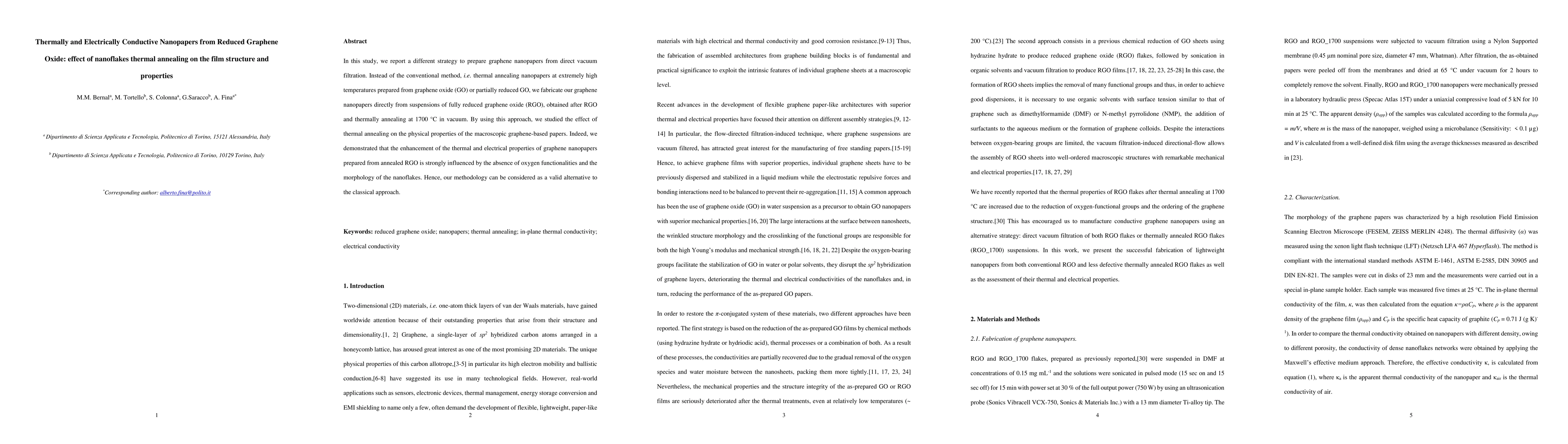 Summary: This research develops thermally and electrically conductive graphene nanopapers via vacuum filtration from fully reduced graphene oxide thermally annealed at 1700°C. The study finds that annealing enhances properties due to reduced oxygen functionalities and optimal nanoflake morphology, presenting an alternative to traditional high-temperature methods.