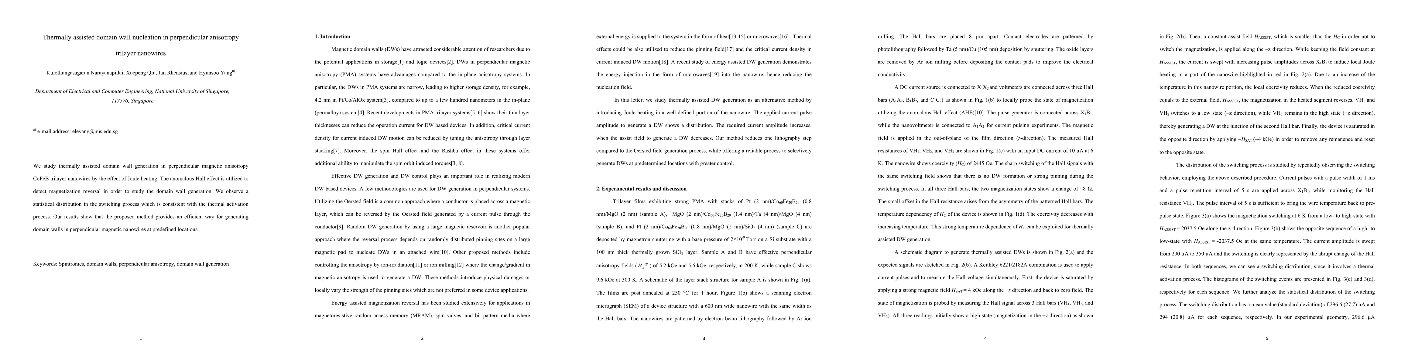 This research investigates thermally assisted domain wall nucleation in CoFeB trilayer nanowires with perpendicular magnetic anisotropy via Joule heating, utilizing the anomalous Hall effect to detect magnetization reversal. The study finds a statistical distribution in the switching process consistent with thermal activation, demonstrating an efficient method for domain wall generation at specific locations.