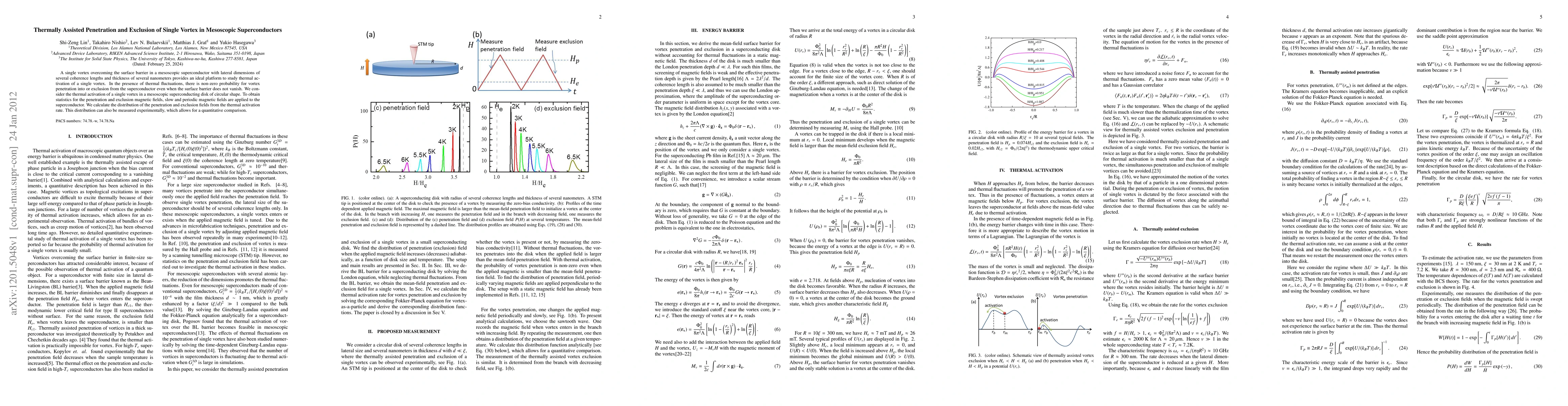 Researchers study how thermal fluctuations affect a single vortex in mesoscopic superconductors, finding that even with surface barriers, there is a non-zero probability for the vortex to penetrate or be excluded from the material.
