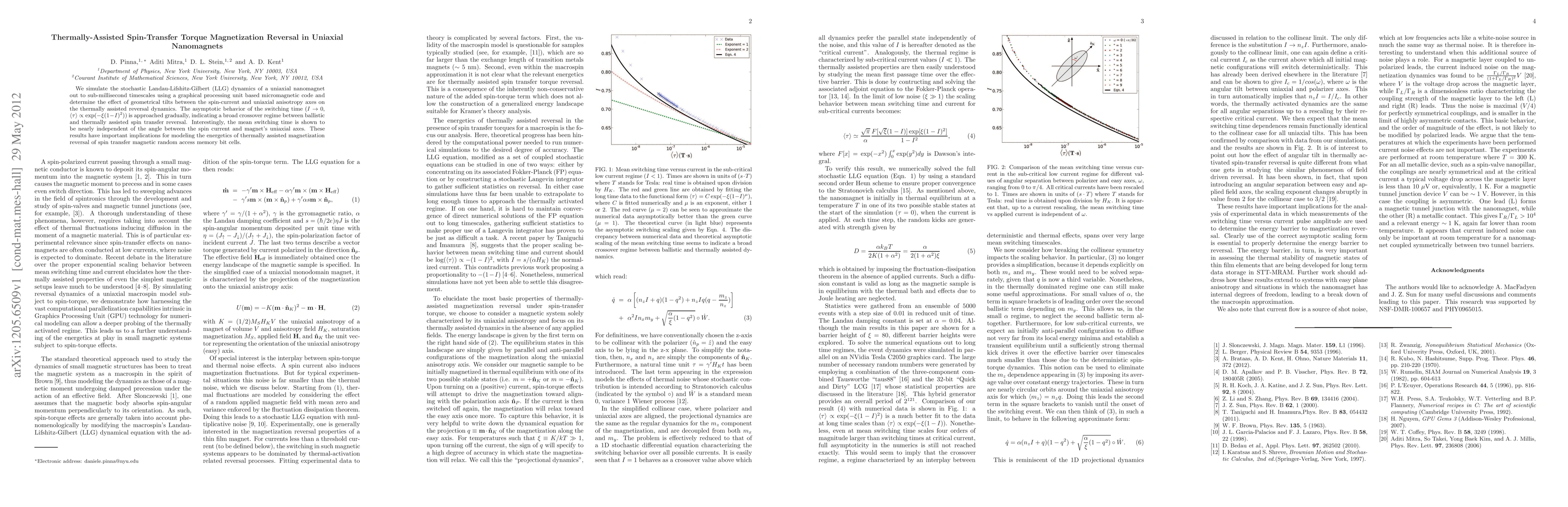 This paper investigates the thermally-assisted spin-transfer torque magnetization reversal in uniaxial nanomagnets using GPU-based micromagnetic simulations. It finds that the mean switching time is largely independent of the angle between the spin current and the uniaxial anisotropy axes, suggesting broad crossover dynamics between ballistic and thermally-assisted reversal.