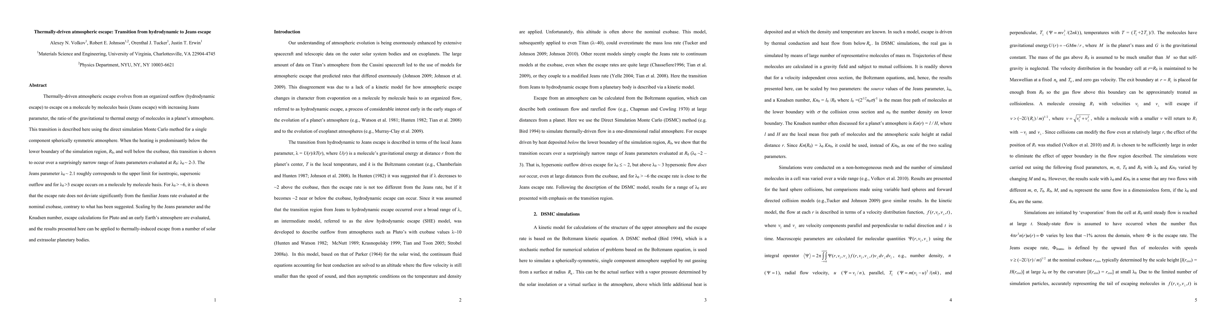 This paper explores the transition from hydrodynamic to Jeans escape in thermally-driven atmospheric escape, demonstrating that the shift occurs at a Jeans parameter λ0 of approximately 2-3. The findings suggest that for λ0 > ~6, escape rates align with Jeans theory, applicable to various planetary atmospheres.