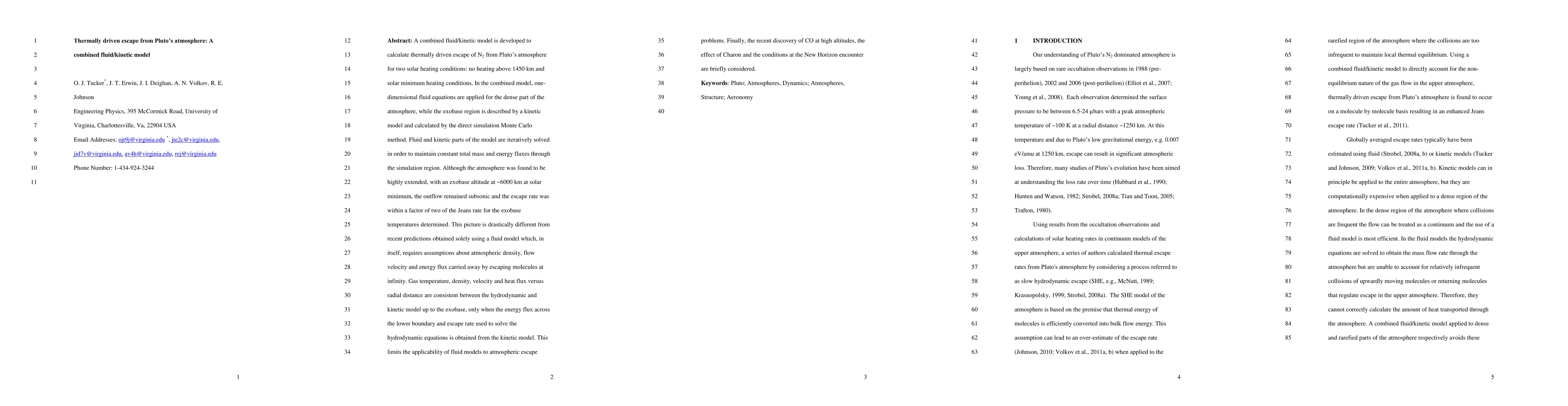 This paper develops a combined fluid/kinetic model to study thermally driven escape of N2 from Pluto's atmosphere under different solar heating conditions. The model shows that the escape rate is subsonic and close to the Jeans rate, contrasting with predictions from fluid models alone, which require assumptions about atmospheric properties.