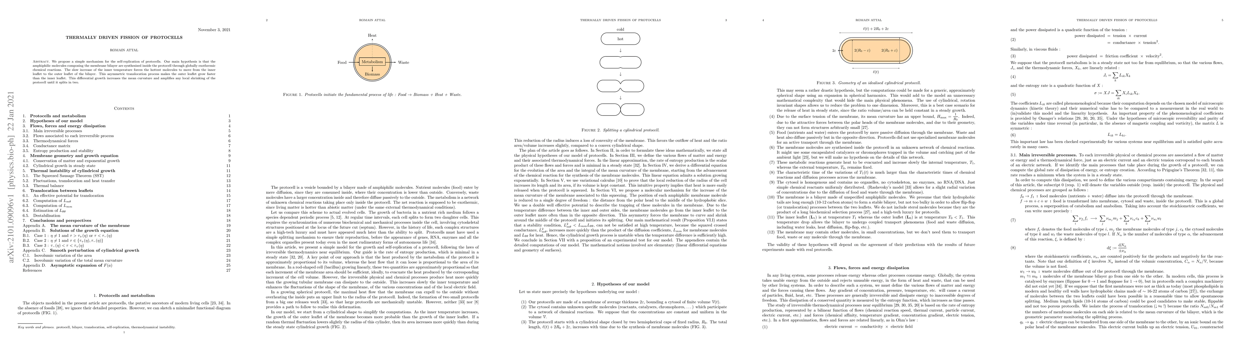 We propose a simple mechanism for the self-replication of protocells. Our main hypothesis is that the amphiphilic molecules composing the membrane bilayer are synthesised inside the protocell through globally exothermic chemical reactions. The slow increase of the inner temperature forces the hottest molecules to move from the inner leaflet to the outer leaflet of the bilayer. This asymmetric translocation process makes the outer leaflet grow faster than the inner leaflet. This differential growth increases the mean curvature and amplifies any local shrinking of the protocell until it splits in two.