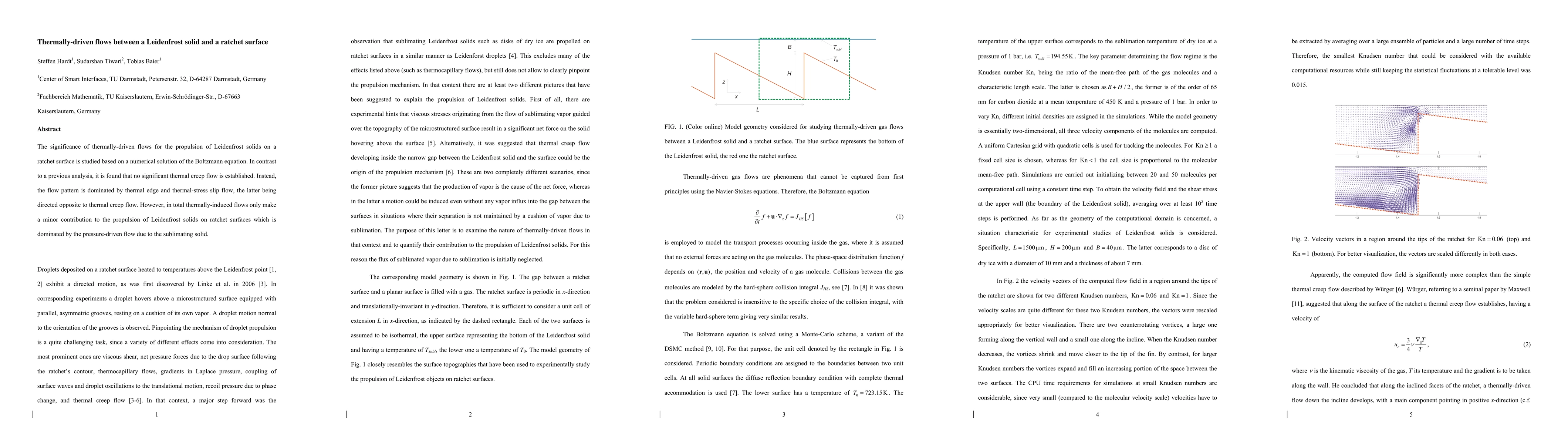 The significance of thermally-driven flows for the propulsion of Leidenfrost solids on a ratchet surface is studied based on a numerical solution of the Boltzmann equation. In contrast to a previous analysis, it is found that no significant thermal creep flow is established. Instead, the flow pattern is dominated by thermal edge and thermal-stress slip flow, the latter being directed opposite to thermal creep flow. However, in total thermally-induced flows only make a minor contribution to the propulsion of Leidenfrost solids on ratchet surfaces which is dominated by the pressure-driven flow due to the sublimating solid.