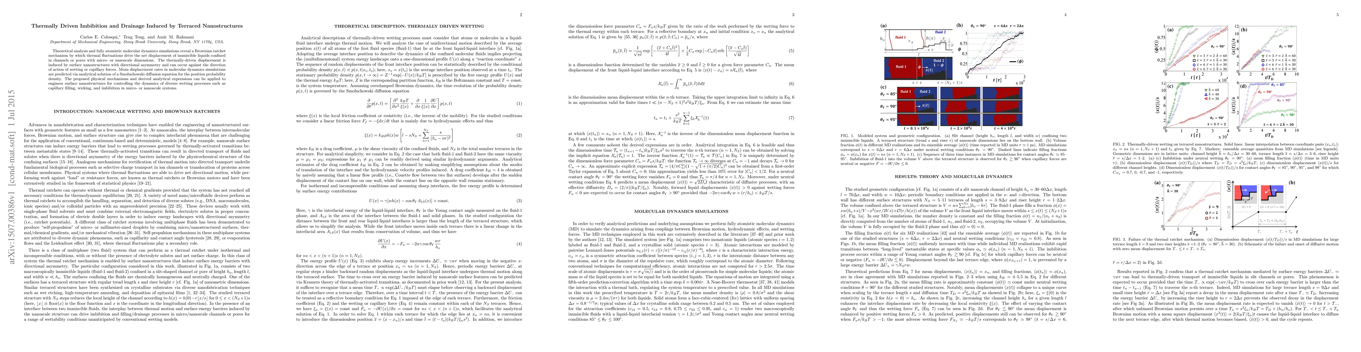 Theoretical analysis and fully atomistic molecular dynamics simulations reveal a Brownian ratchet mechanism by which thermal fluctuations drive the net displacement of immiscible liquids confined in channels or pores with micro- or nanoscale dimensions. The thermally-driven displacement is induced by surface nanostructures with directional asymmetry and can occur against the direction of action of wetting or capillary forces. Mean displacement rates in molecular dynamics simulations are predicted via analytical solution of a Smoluchowski diffusion equation for the position probability density. The proposed physical mechanisms and derived analytical expressions can be applied to engineer surface nanostructures for controlling the dynamics of diverse wetting processes such as capillary filling, wicking, and imbibition in micro- or nanoscale systems.
