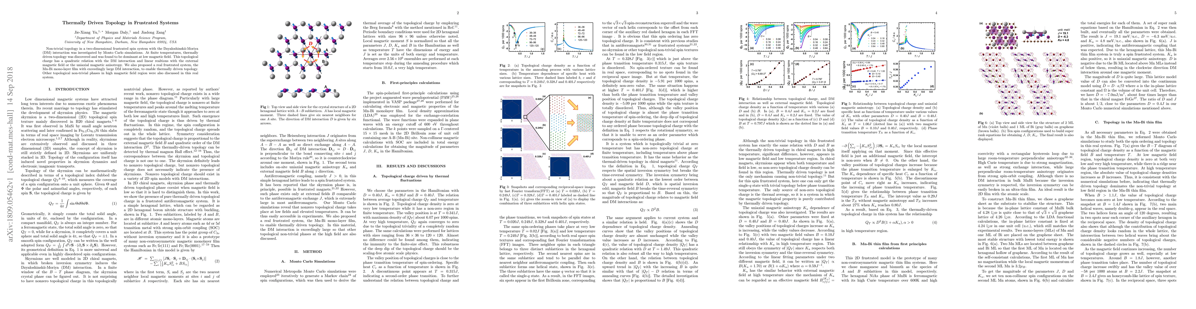 Researchers discovered thermally driven topology in frustrated spin systems at low magnetic fields, with a quadratic relation to DM interaction and linear relations to external magnetic field or anisotropy. A proposed real system, Mn-Bi mono-layer film, enables this phenomenon.