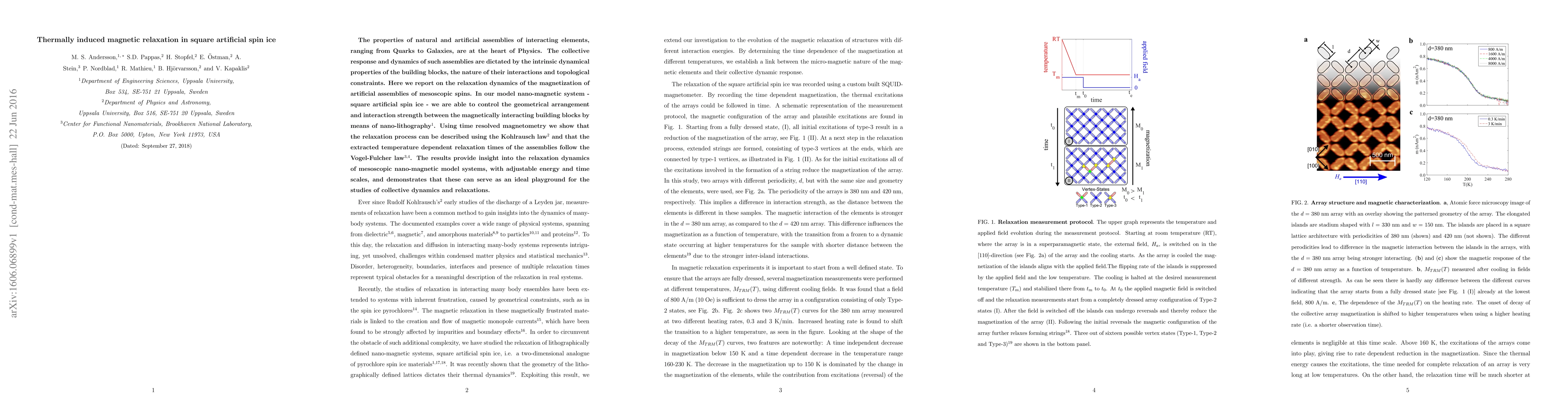 The properties of natural and artificial assemblies of interacting elements, ranging from Quarks to Galaxies, are at the heart of Physics. The collective response and dynamics of such assemblies are dictated by the intrinsic dynamical properties of the building blocks, the nature of their interactions and topological constraints. Here we report on the relaxation dynamics of the magnetization of artificial assemblies of mesoscopic spins. In our model nano-magnetic system - square artificial spin ice - we are able to control the geometrical arrangement and interaction strength between the magnetically interacting building blocks by means of nano-lithography. Using time resolved magnetometry we show that the relaxation process can be described using the Kohlrausch law and that the extracted temperature dependent relaxation times of the assemblies follow the Vogel-Fulcher law. The results provide insight into the relaxation dynamics of mesoscopic nano-magnetic model systems, with adjustable energy and time scales, and demonstrates that these can serve as an ideal playground for the studies of collective dynamics and relaxations.