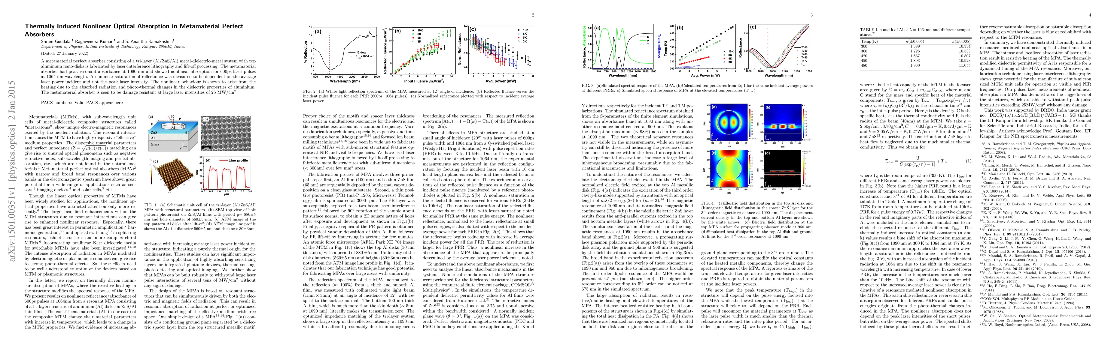 This paper investigates a tri-layer metamaterial perfect absorber with peak absorbance at 1090 nm, demonstrating nonlinear optical absorption due to thermal effects from 600 ps laser pulses at 1064 nm. The absorber exhibits damage resistance at high laser intensities, attributing the nonlinear behaviour to photo-thermal changes in the aluminium layers.