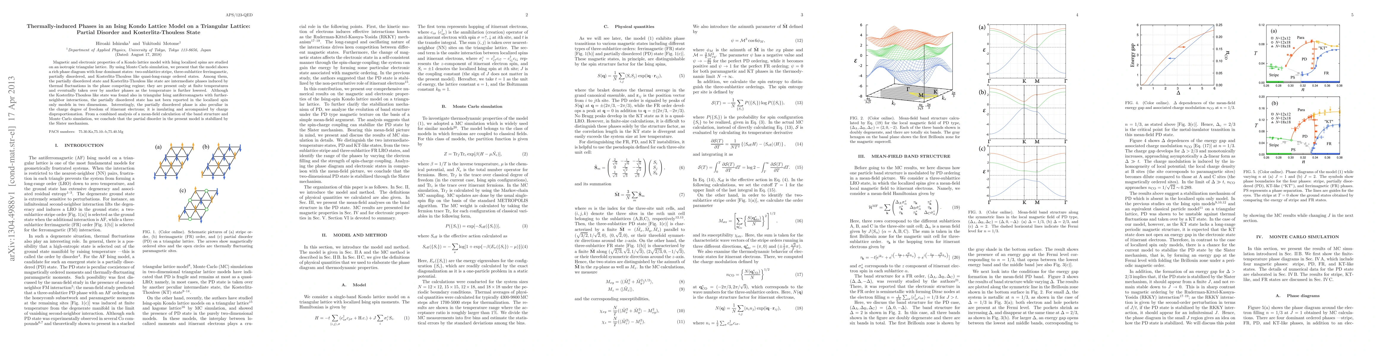 This paper investigates the magnetic and electronic properties of an Ising Kondo lattice model on a triangular lattice, revealing a complex phase diagram with four dominant states. The study identifies a partially disordered phase and a Kosterlitz-Thouless like quasi-long-range ordered state, both induced by thermal fluctuations, and notes the unique insulating nature and charge disproportionation of the partially disordered phase, stabilized by the Slater mechanism.